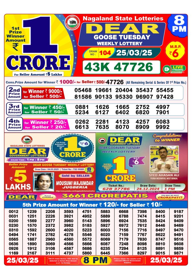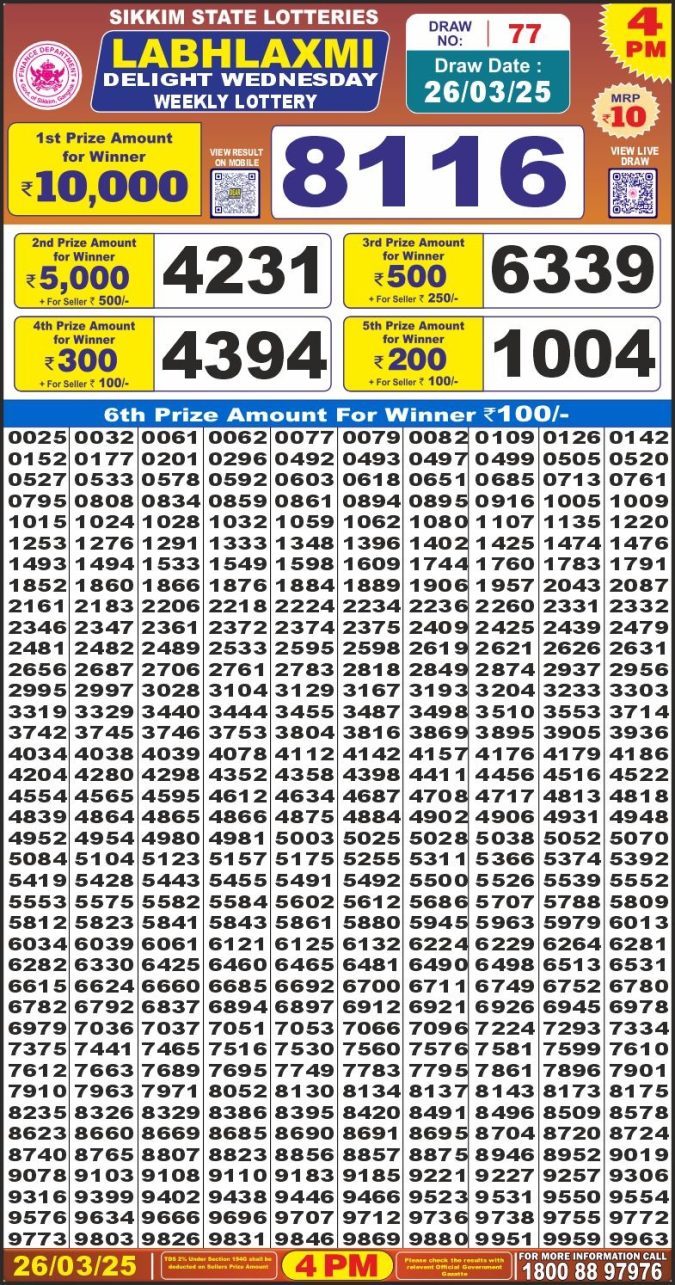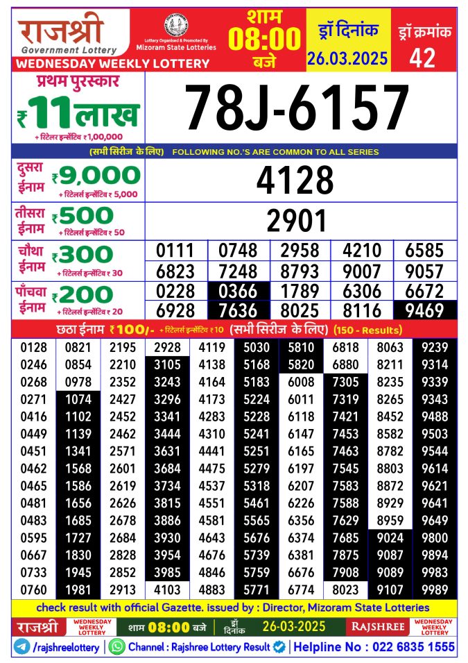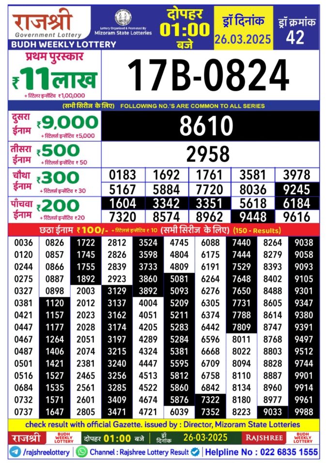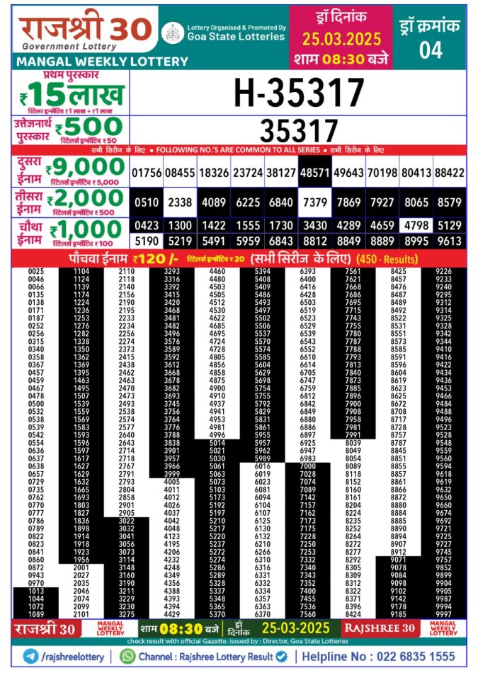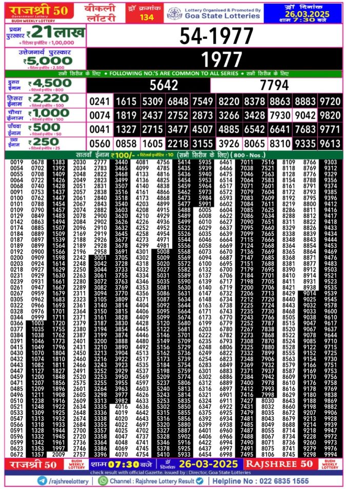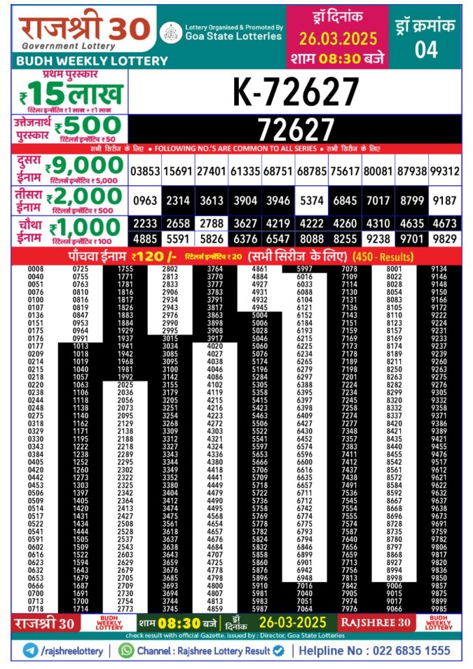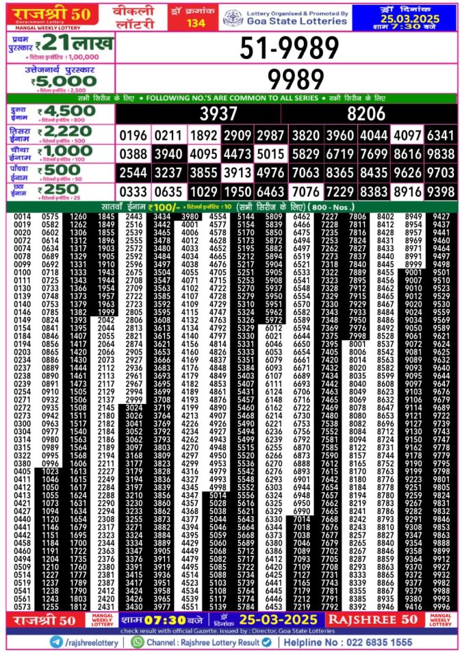 Rajshree som Weekly Lottery 1PM Result 3.3.25