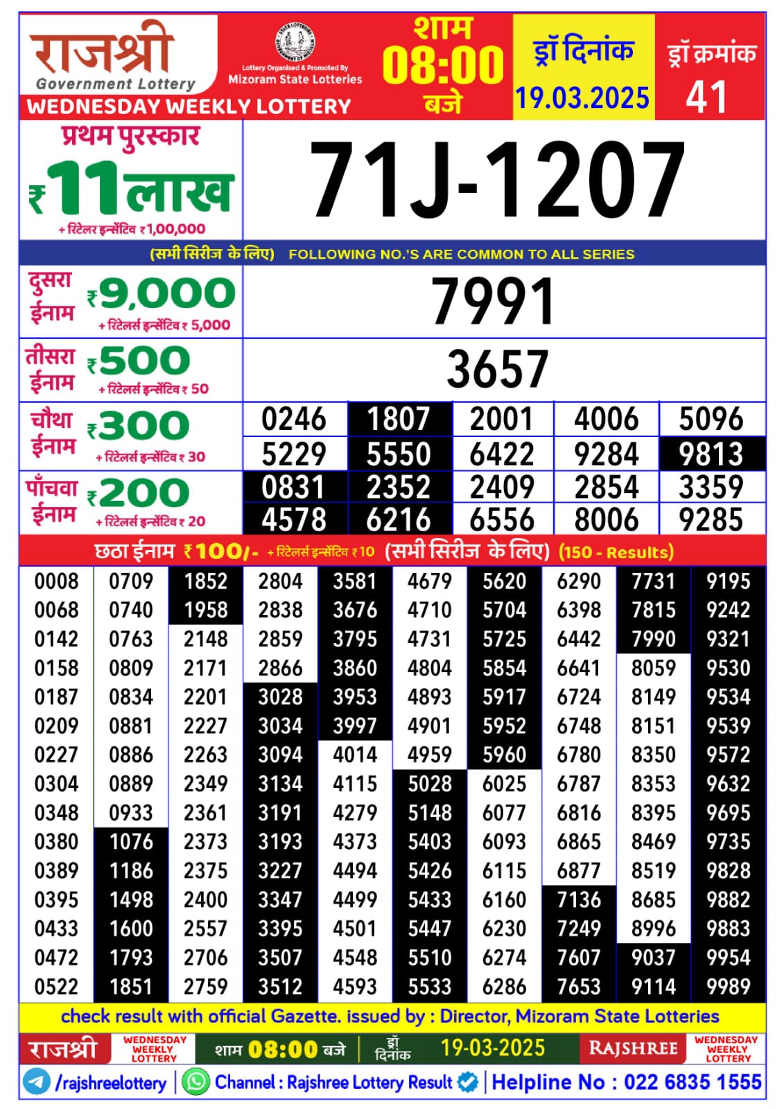 Rajshree Weekly Lottery 8PM Result 19.3.25