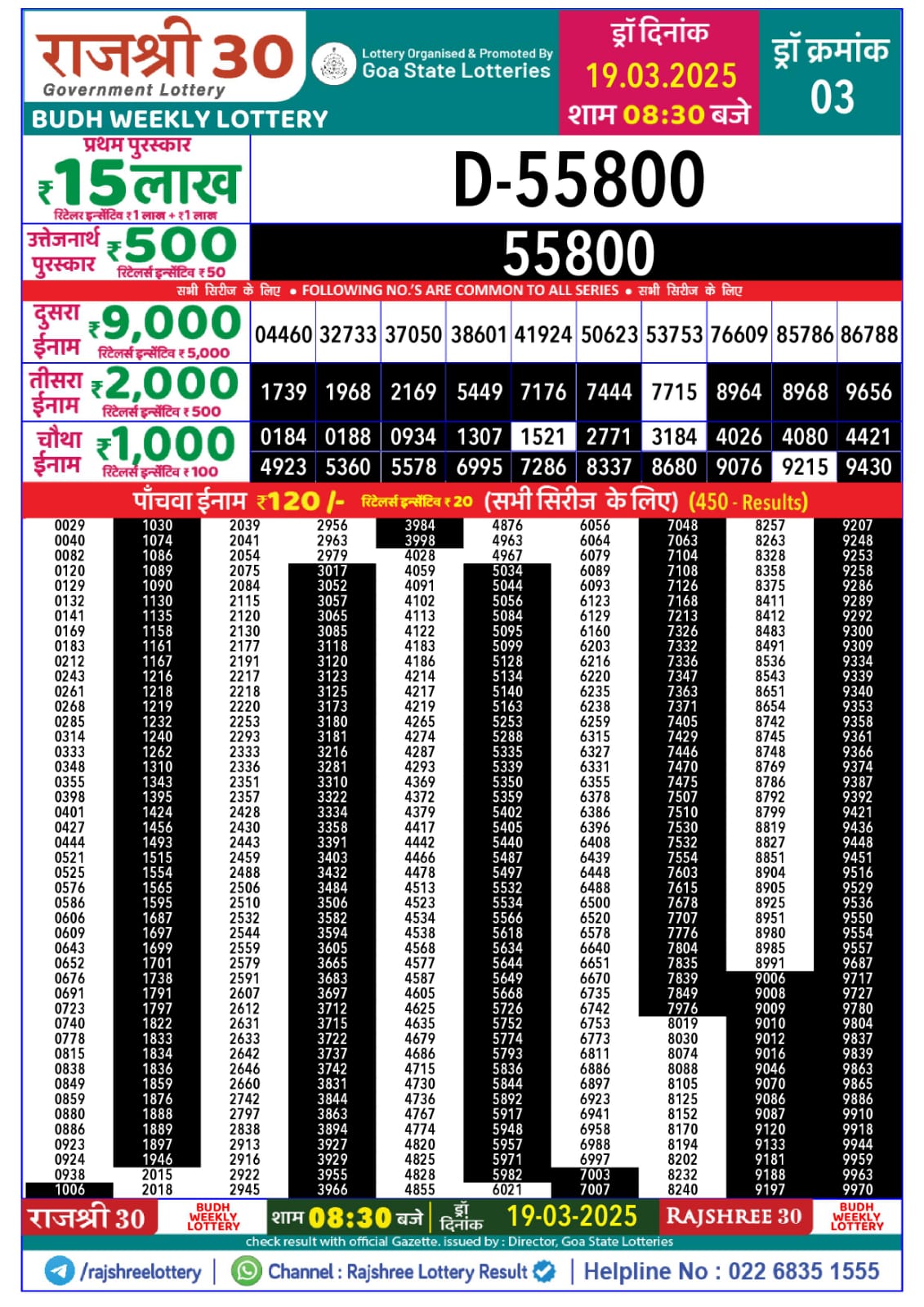 Rajshree 30 Lottery 8:30PM Result 19.3.25