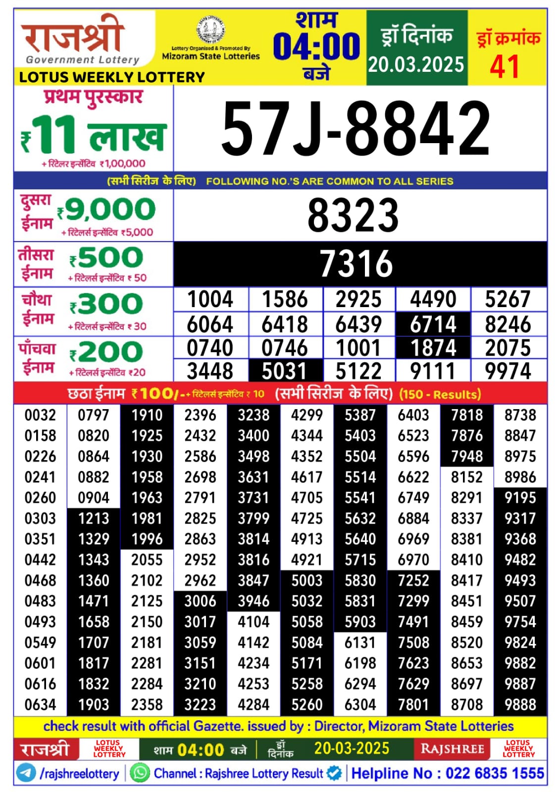 Rajshree Lotus Thursday Weekly Lottery 4PM Result 20.3.25