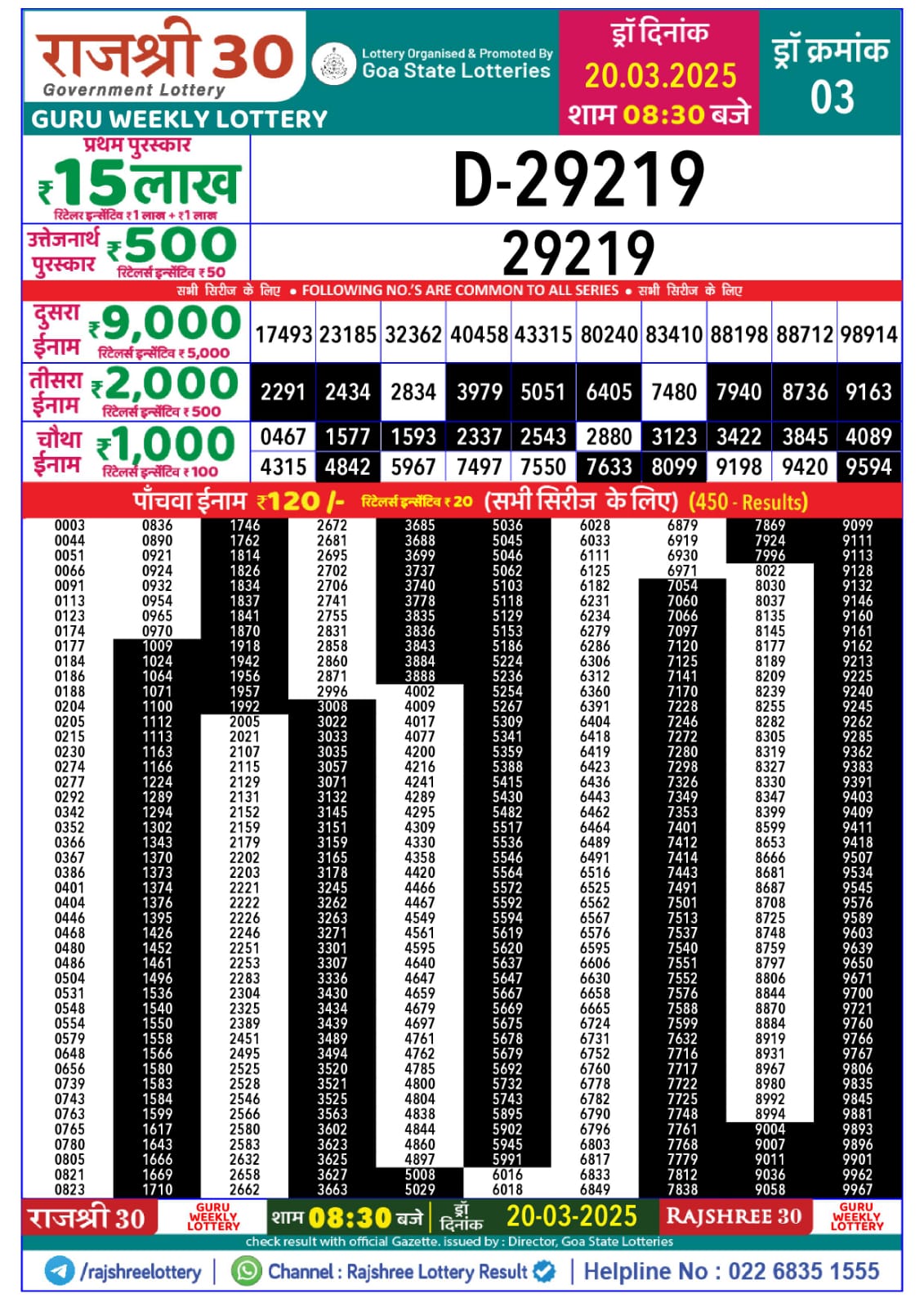 Rajshree 50 Lottery 7:30PM Result 20.3.25