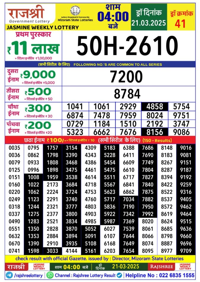 Rajshree jasmine Friday Weekly Lottery 4PM Result 21.3.25