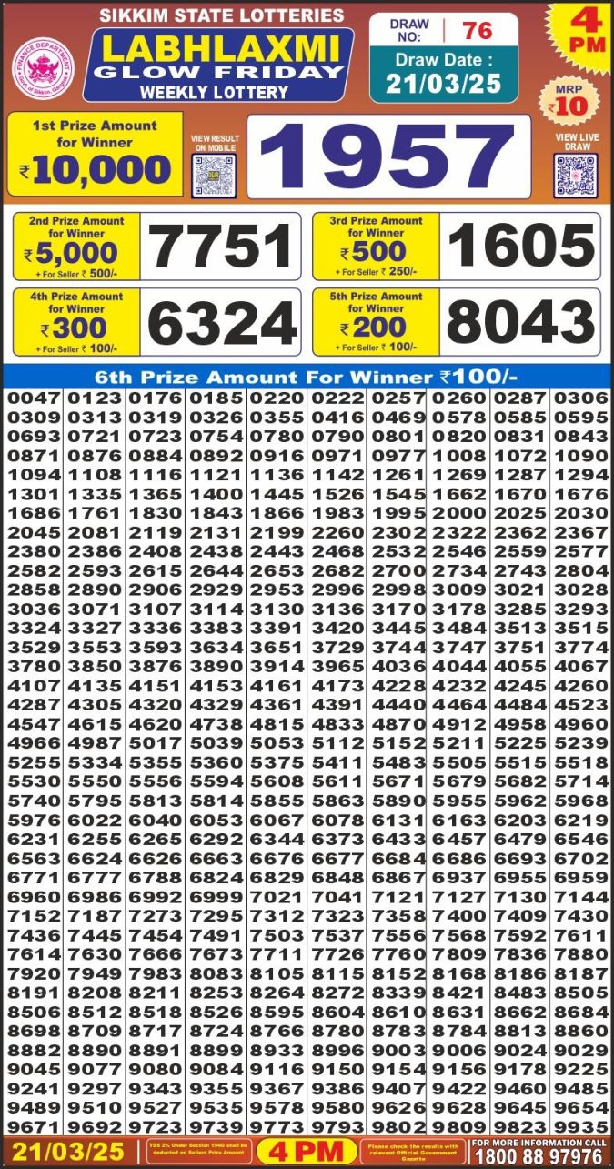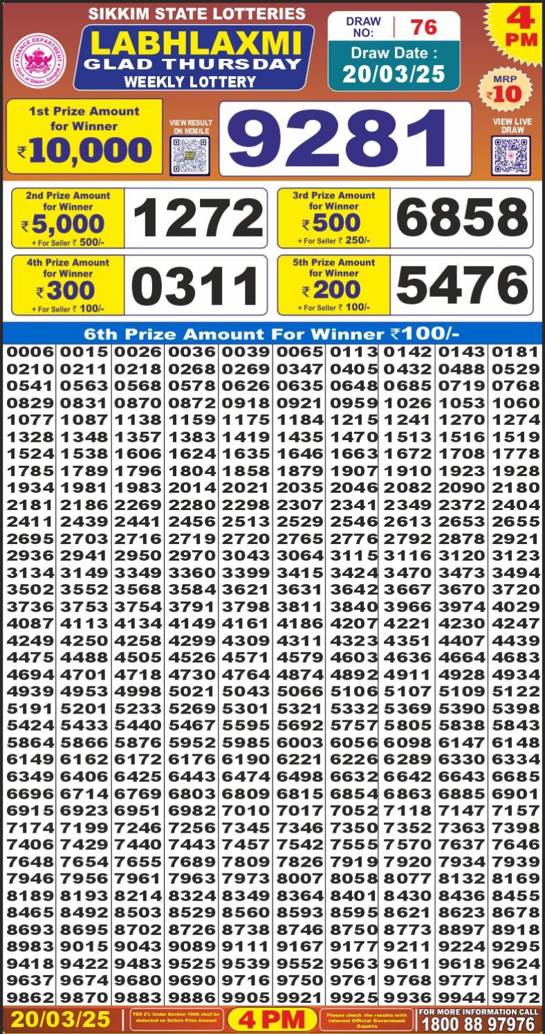Labh Laxmi Glad weekly 4PM Result 20.3.25