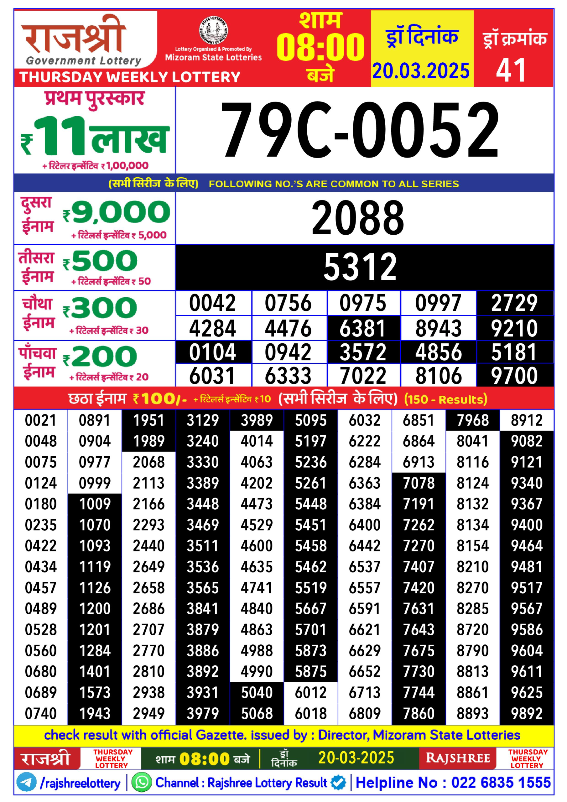 Rajshree Thursday Weekly Lottery 8PM Result 20.3.25