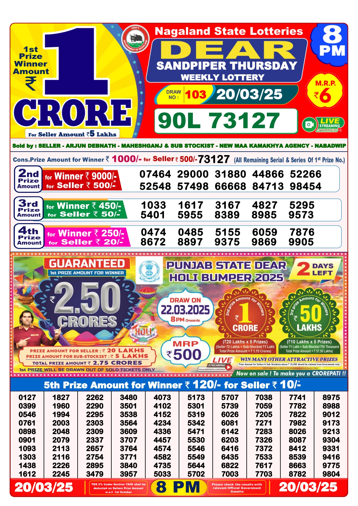 Dear Sandpiper Thursday Weekly Lottery 8PM Result 20.3.25