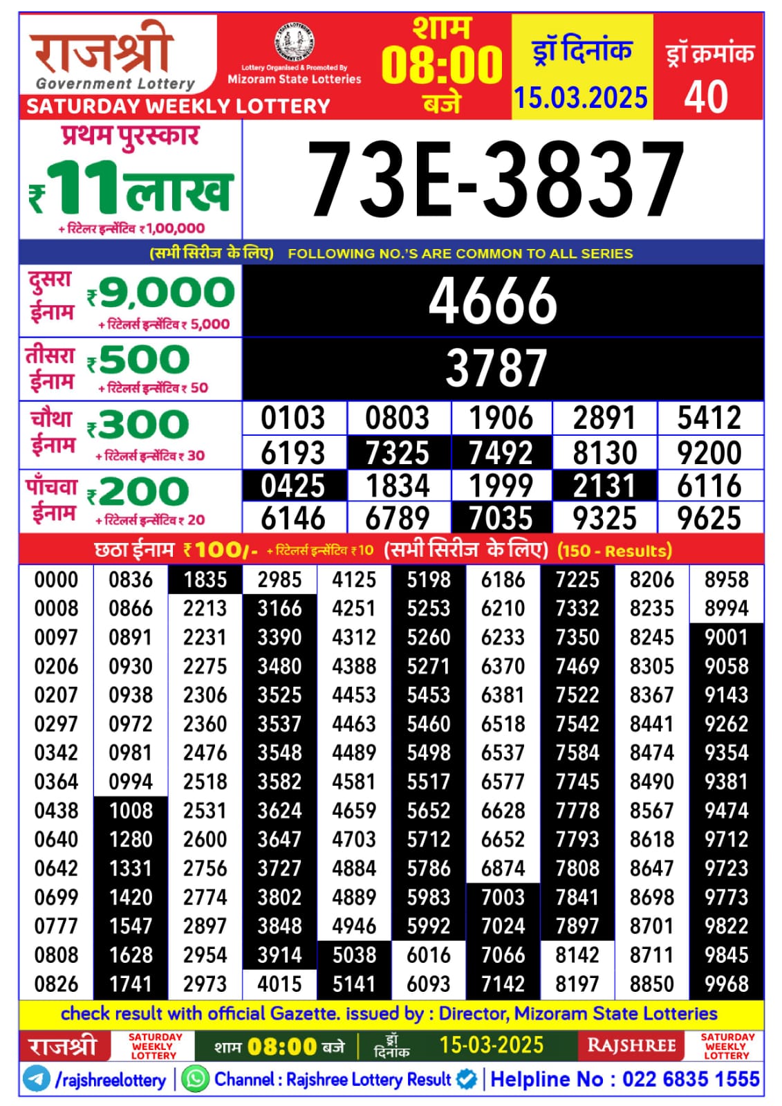 Rajshree Weekly Lottery 8PM Result 15.3.25