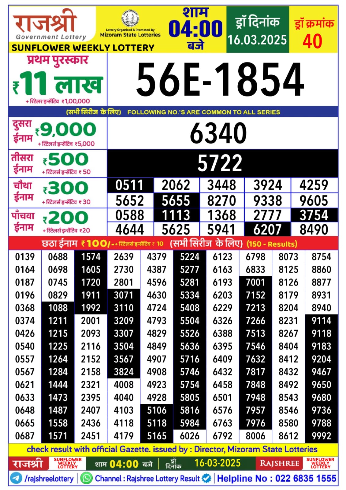 Rajshree sunflower sunday Weekly Lottery 4PM Result 16.3.25