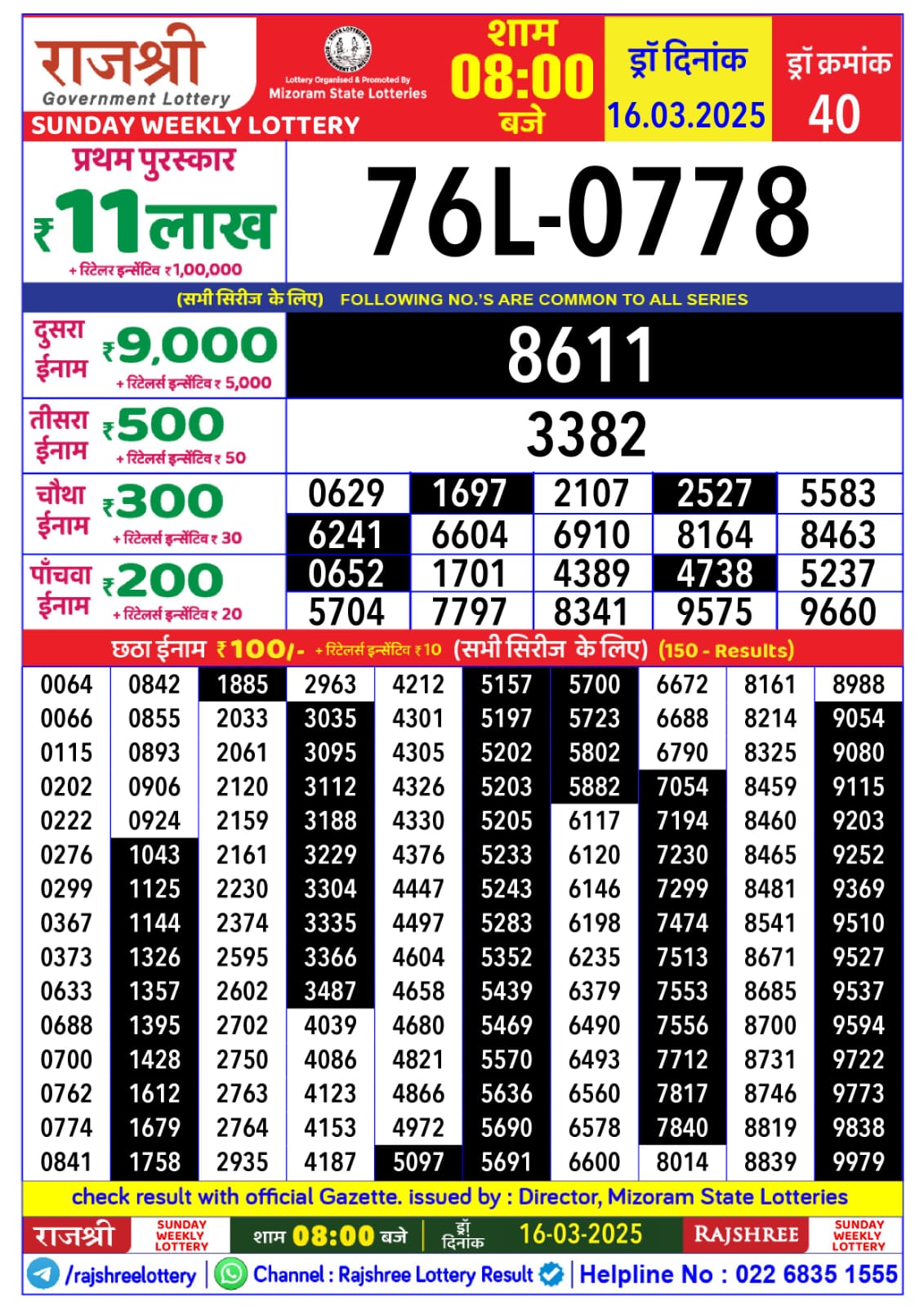 Rajshree Weekly Lottery 8PM Result 16.3.25