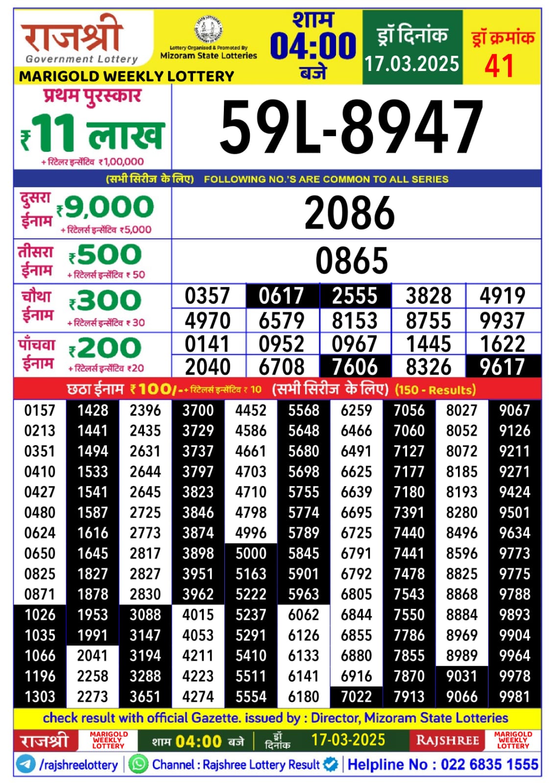 Rajshree marigold monday Weekly Lottery 4PM Result 17.3.25