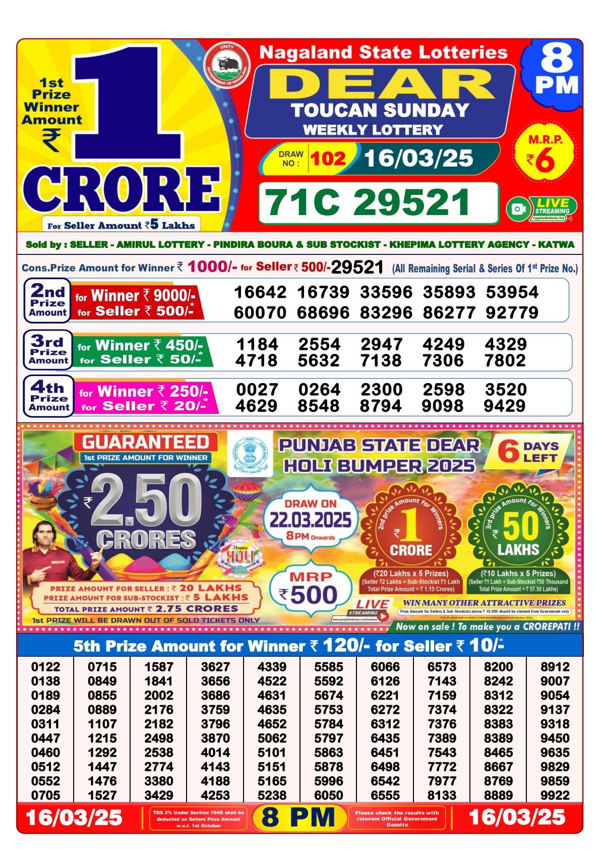 Dear toucan Weekly Lottery 8PM Result 16.3.25