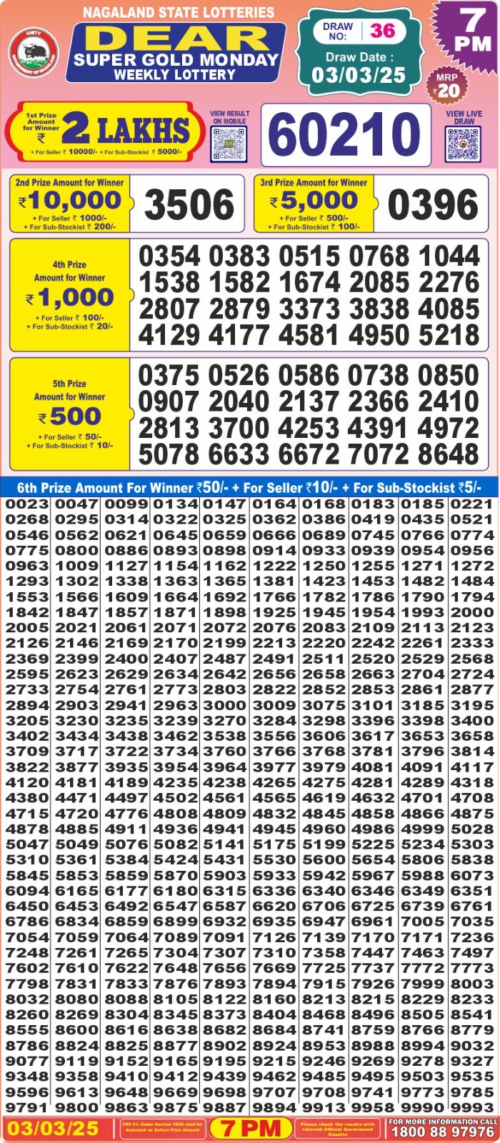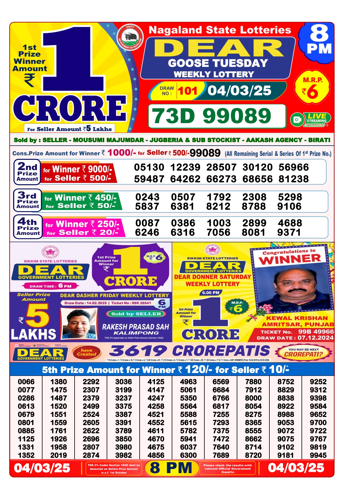 2025-12-06 Punjab State Dear 200 Monthly Lottery 6:00 PM Result 06.12.2025  2025-12-06 Golden Star Weekly Lottery Result 9pm 06.12.2025  2025-12-06 Rajshree 50 Lottery 7:30pm Result 06.12.2025  2025-12-06 Dear Vision Saturday Weekly 1pm Result 06.12.2025  2025-12-05 Rajshree Night Lottery 9pm Result 05.12.2025