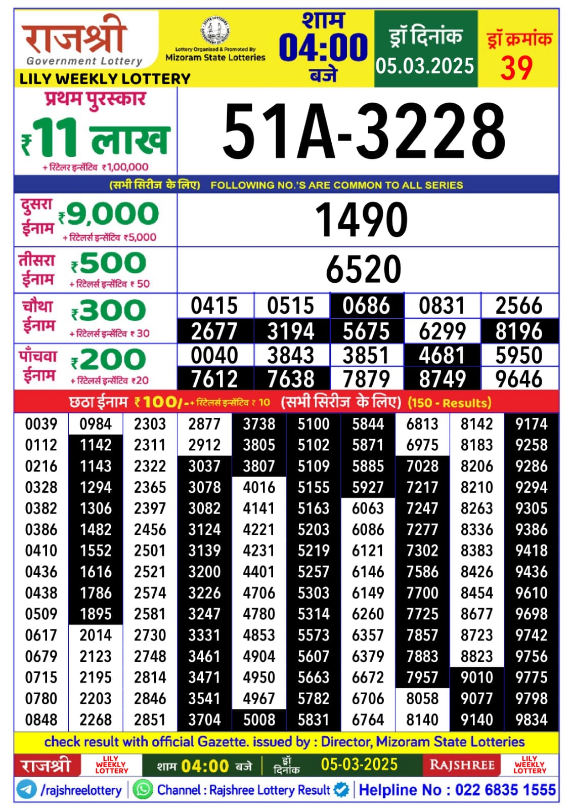 Rajshree Lily Wednesday Weekly Lottery 4PM Result 5.3.25
