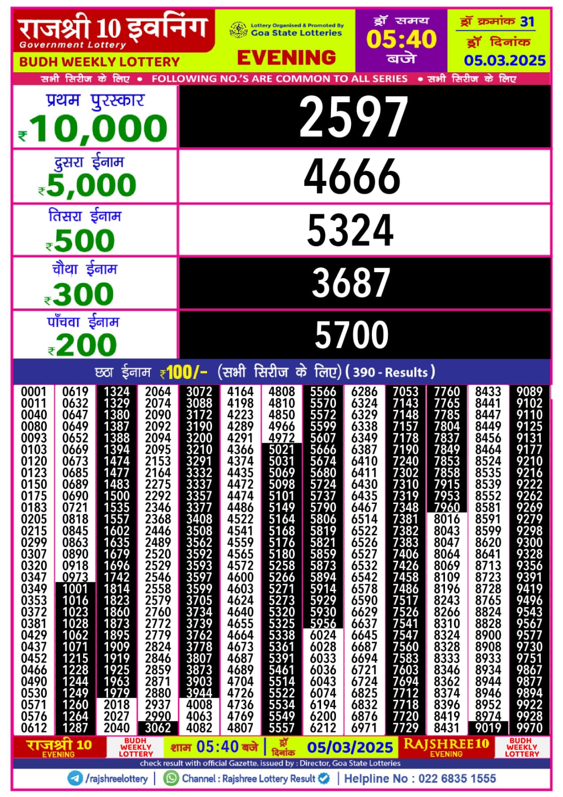 Rajshree 10 evening Wednesday 5:40pm result 5.3.25