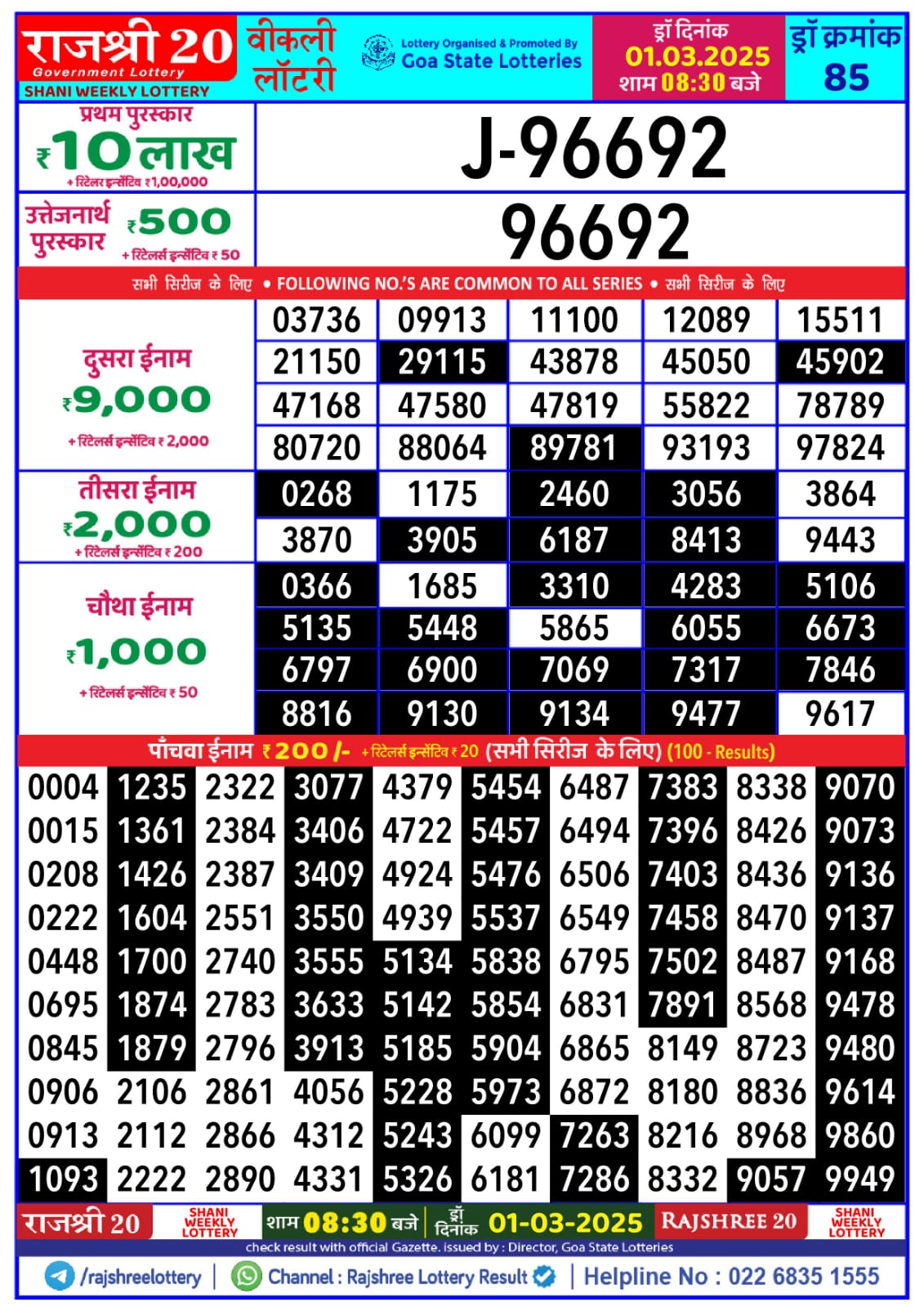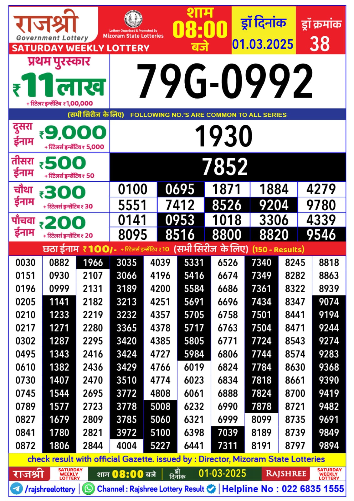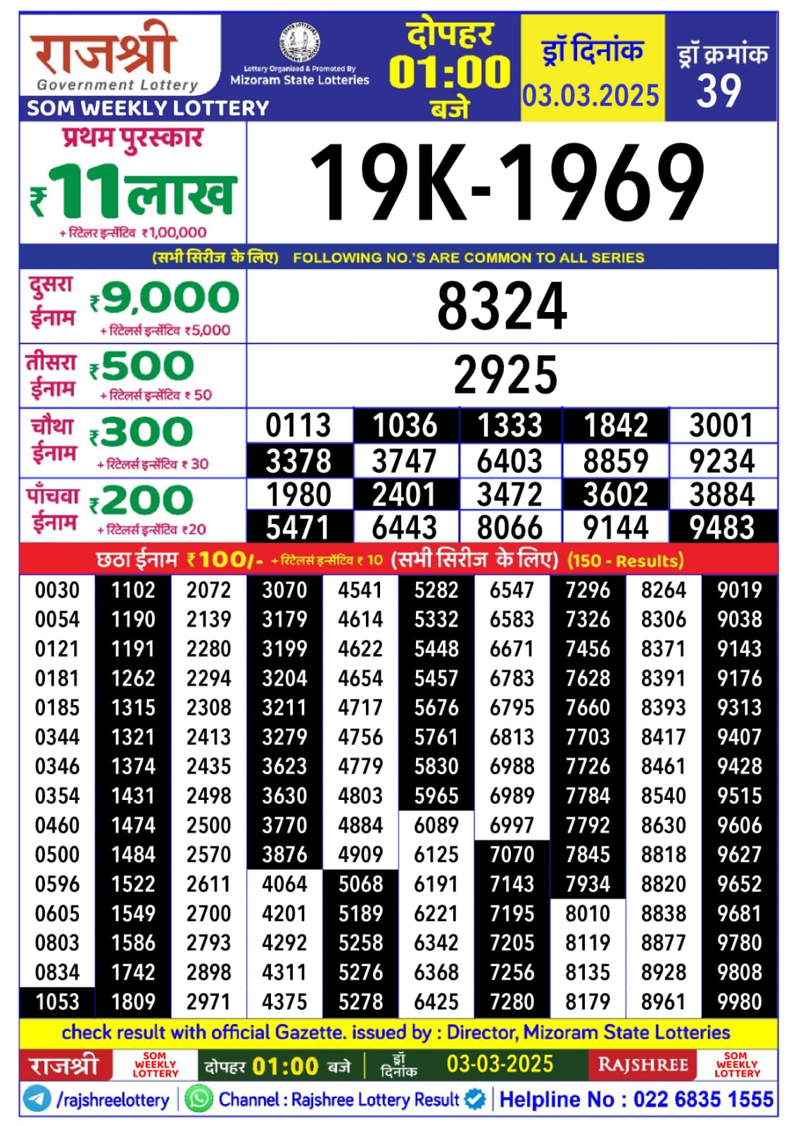 Rajshree som Weekly Lottery 1PM Result 3.3.25