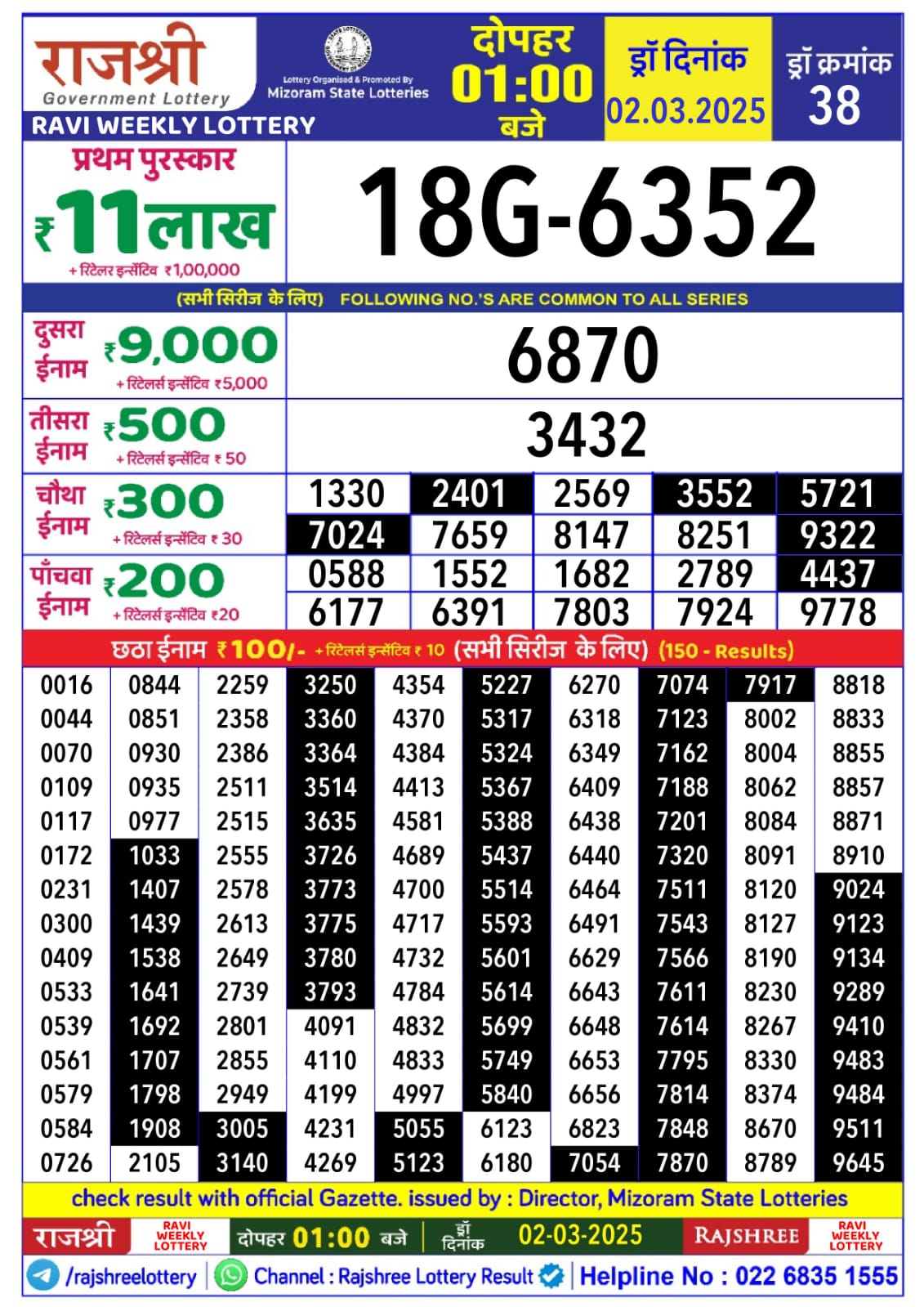 Rajshree ravi  Weekly Lottery 1PM Result 2.3.25