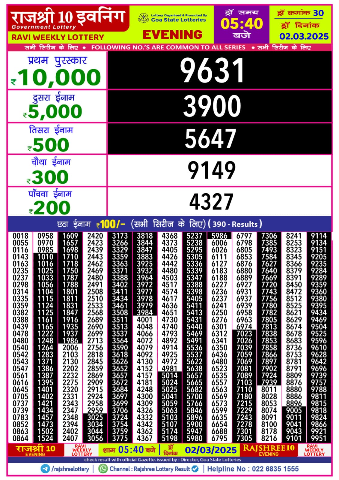 Rajshree 10 evening monday 5:40pm result 3.3.25
