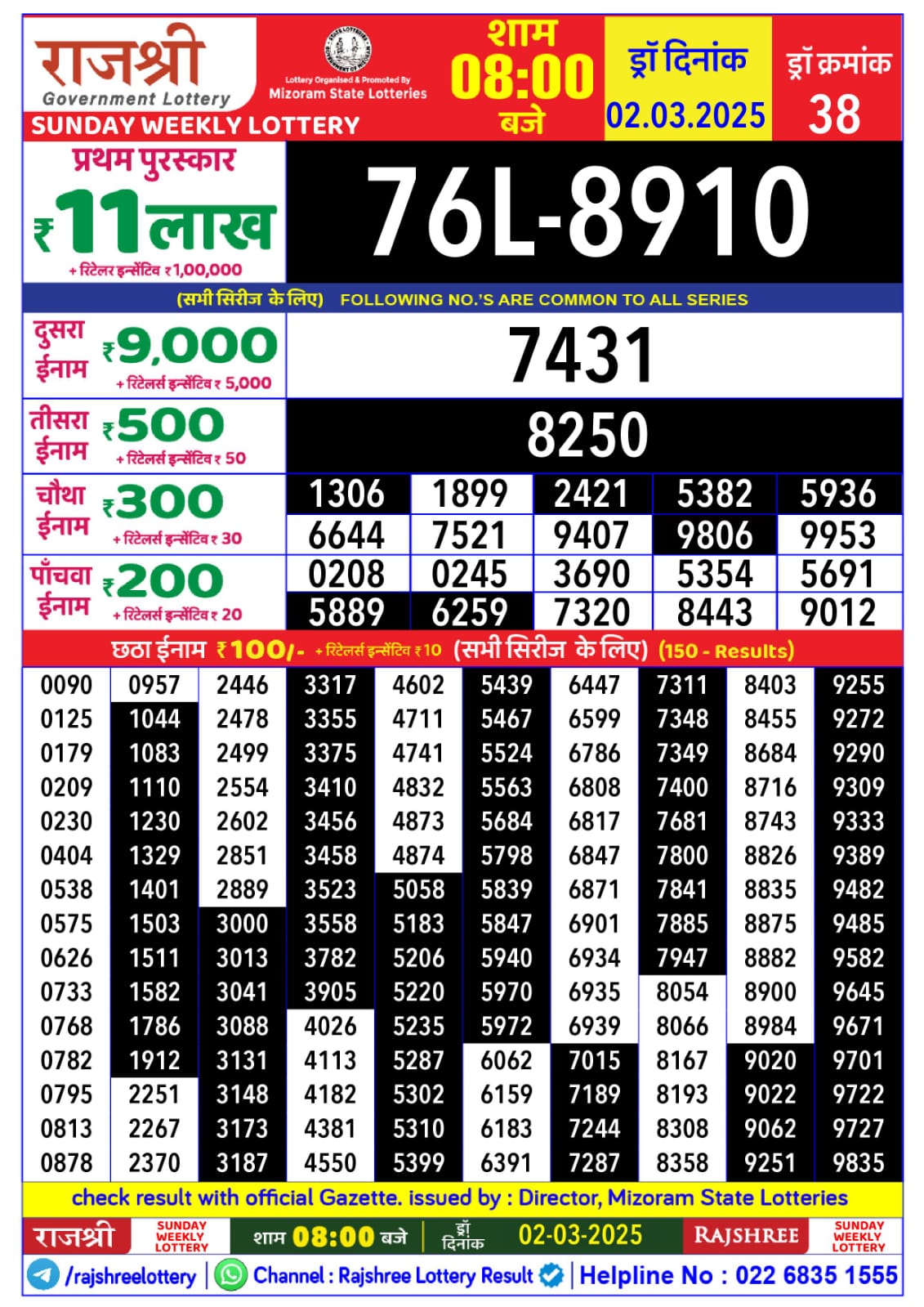 Rajshree Weekly Lottery 8PM Result 2.3.25