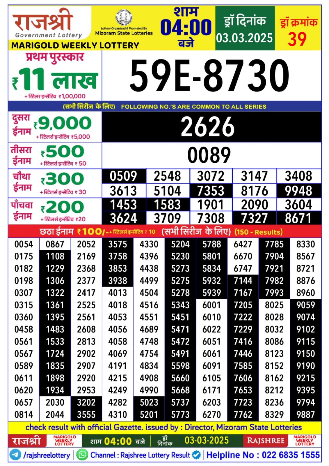 Rajshree marigold monday Weekly Lottery 4PM Result 3.3.25