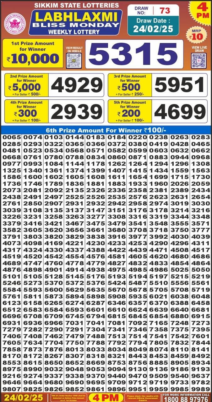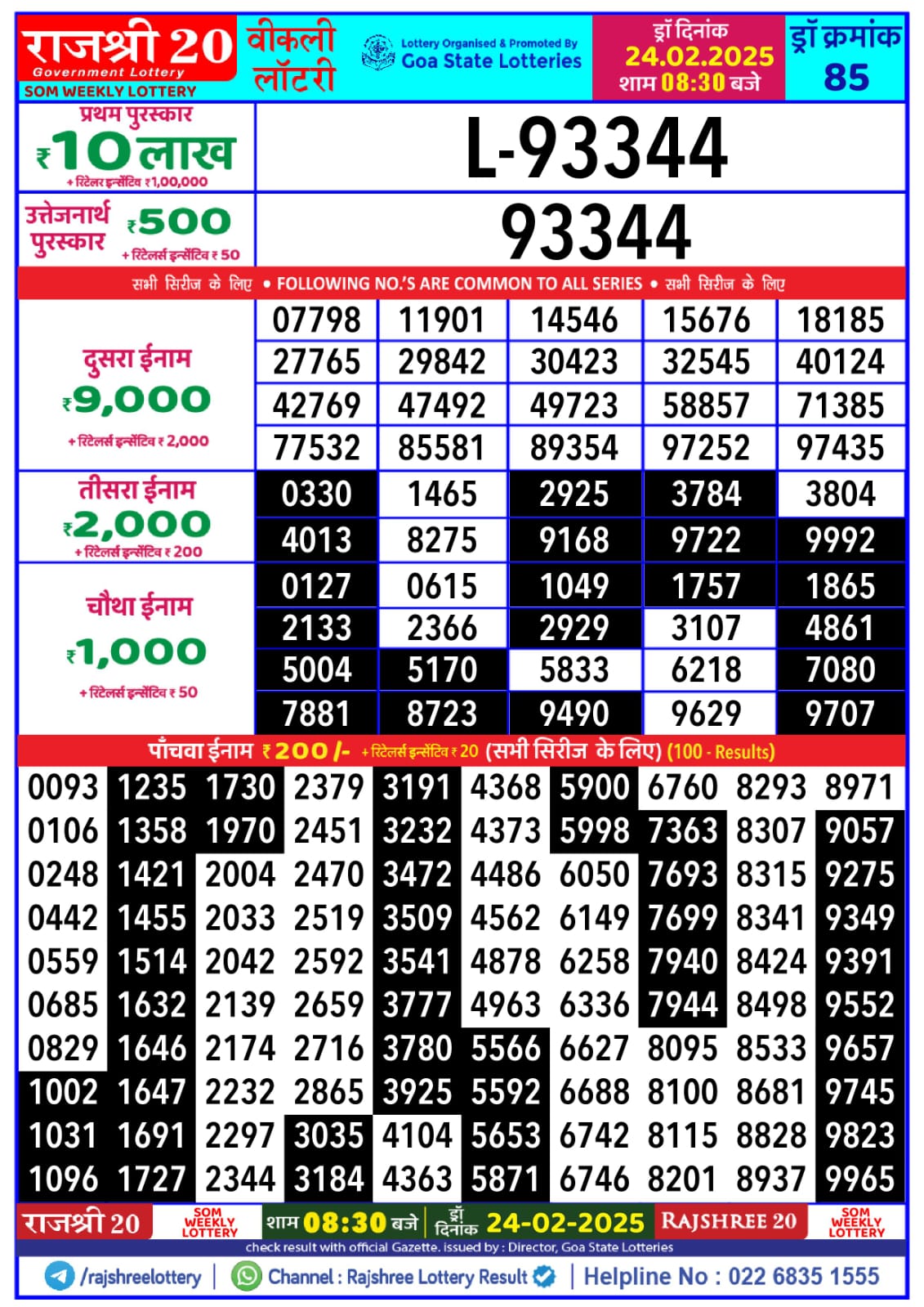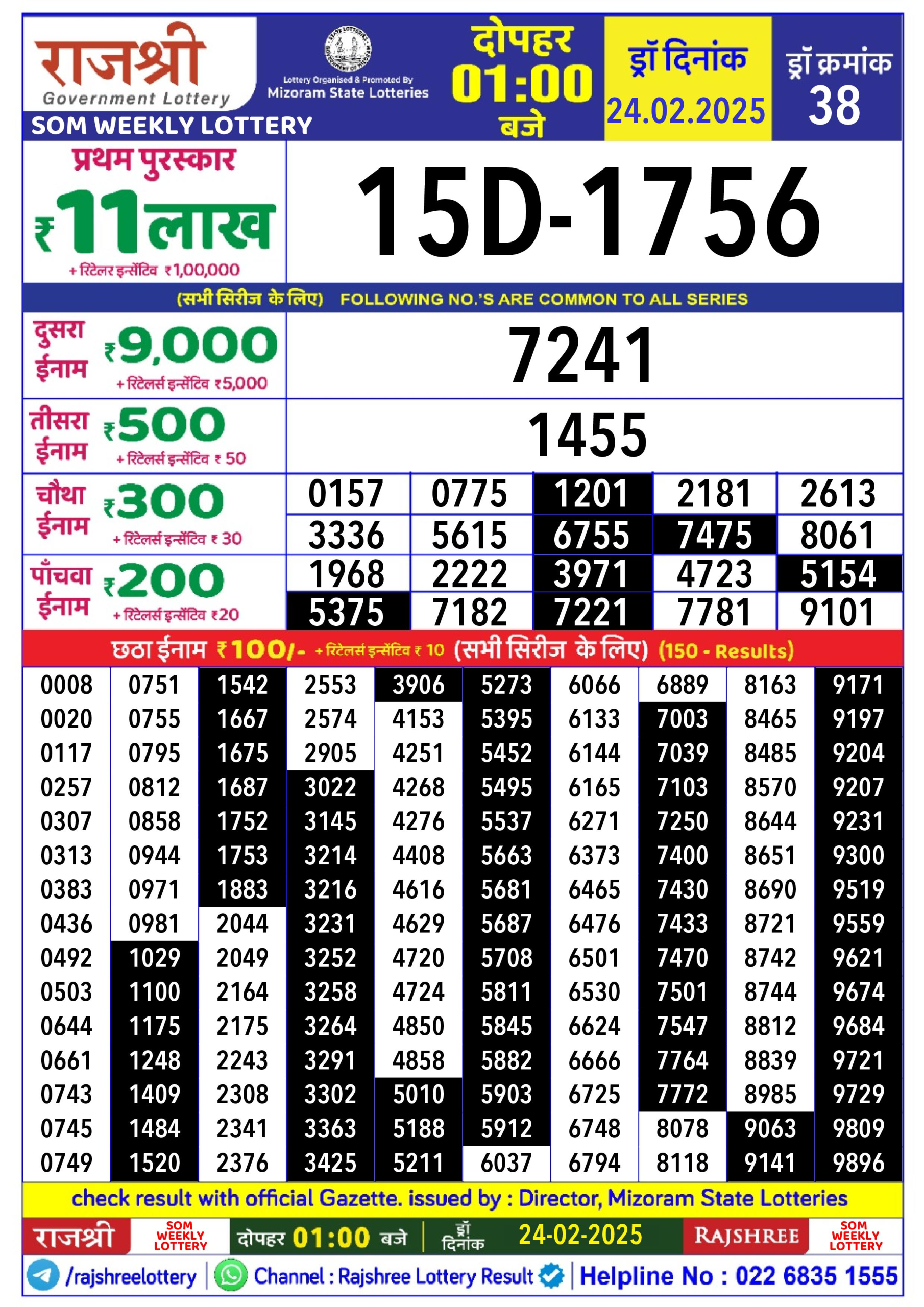 Rajshree som Weekly Lottery 1PM Result 24.2.25