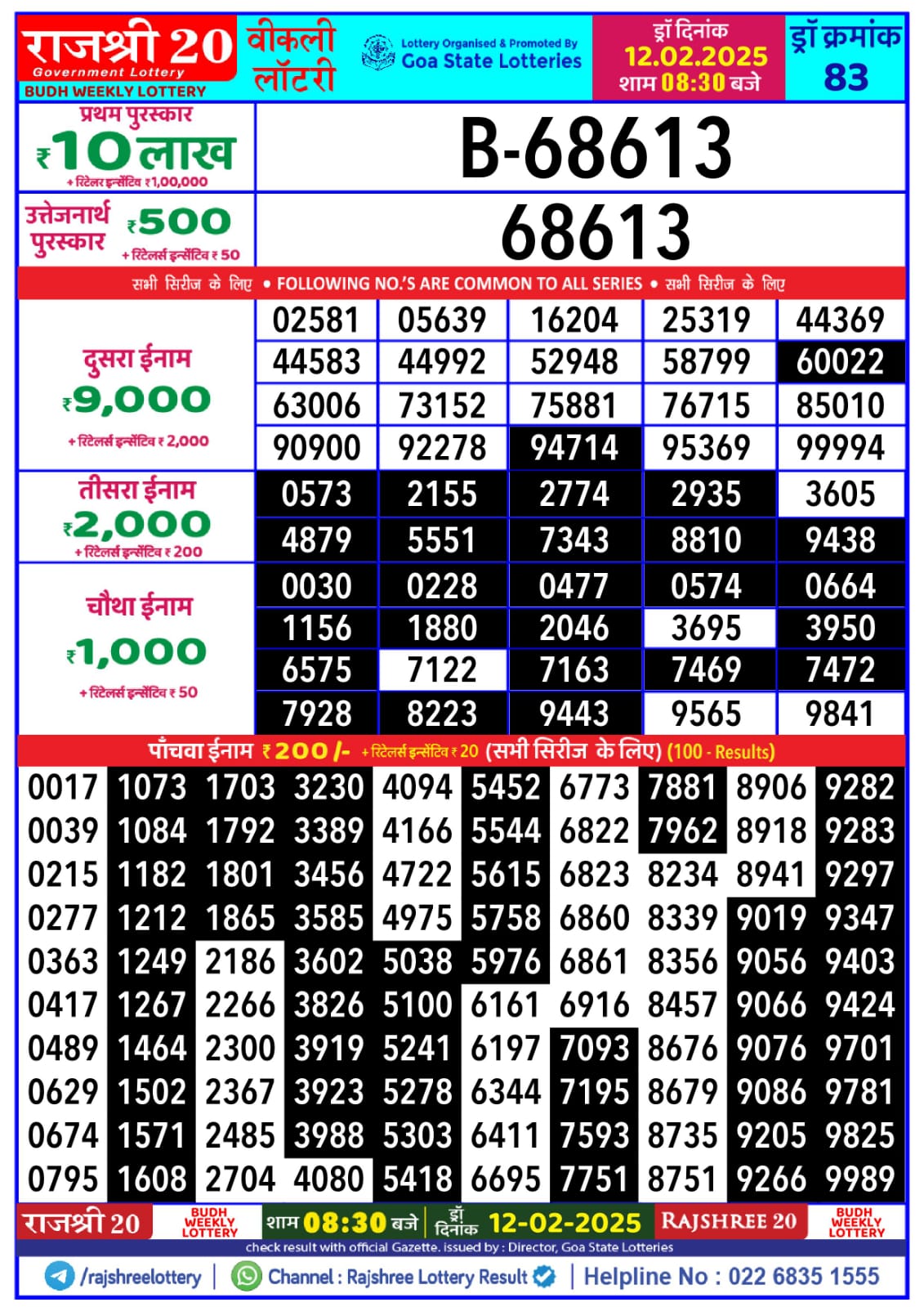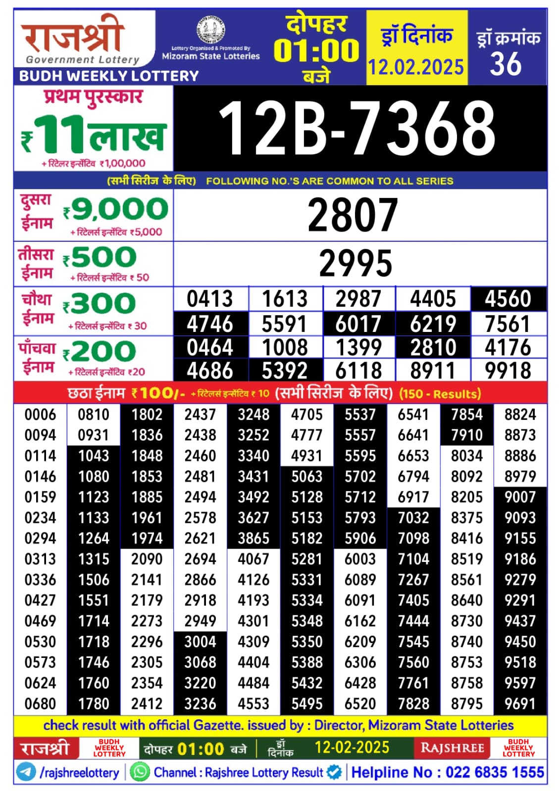 Rajshree Budh Weekly Lottery 1PM Result 12.2.25