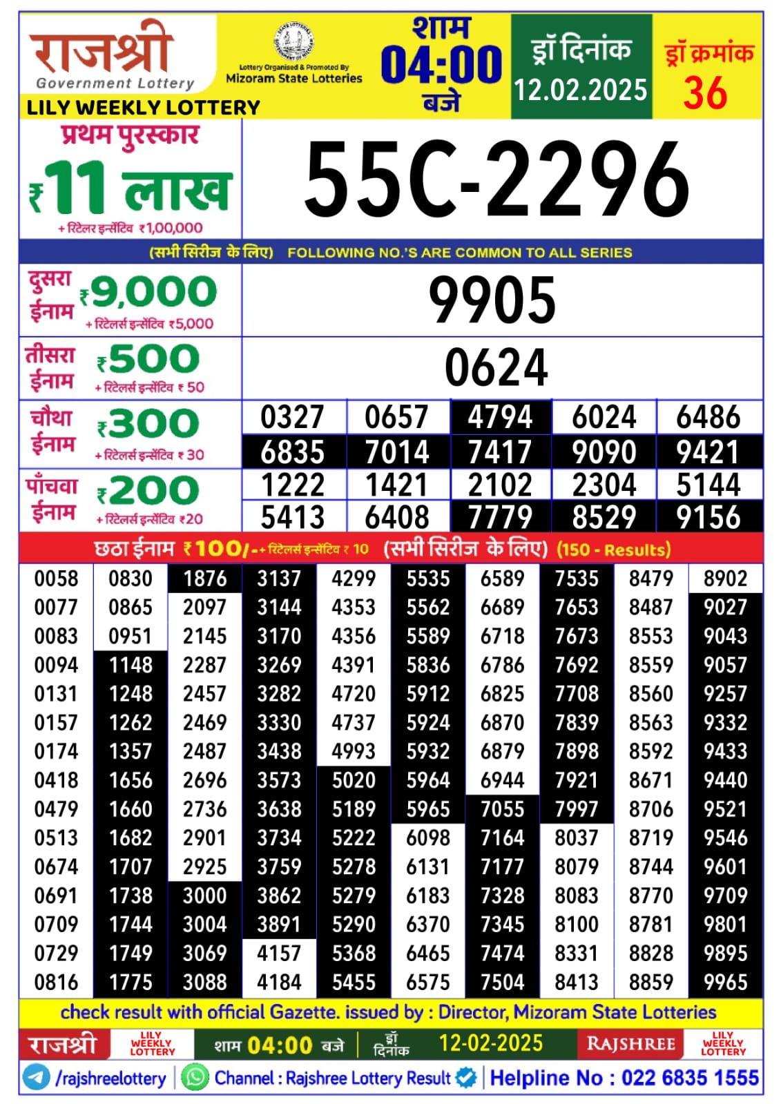 Rajshree Lily Wednesday Weekly Lottery 4PM Result 12.2.25