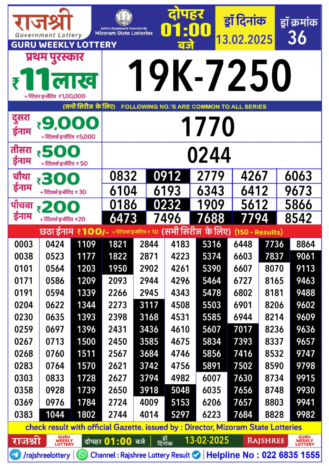 Rajshree Guru Thursday Weekly Lottery 1PM Result 13.2.25