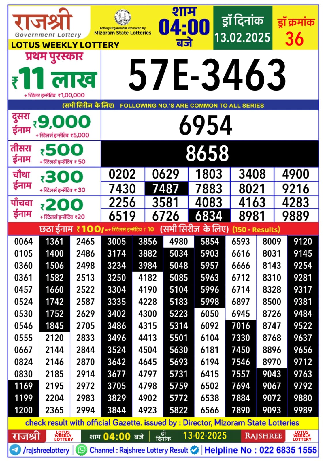 Rajshree Lotus Thursday Weekly Lottery 4PM Result 13.2.25