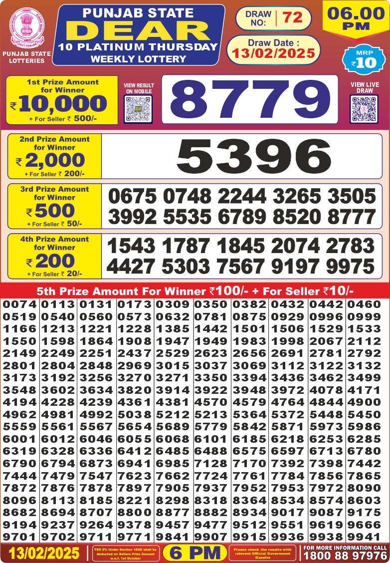 Punjab state dear 100 monthly lottery 8pm result 11.2.25