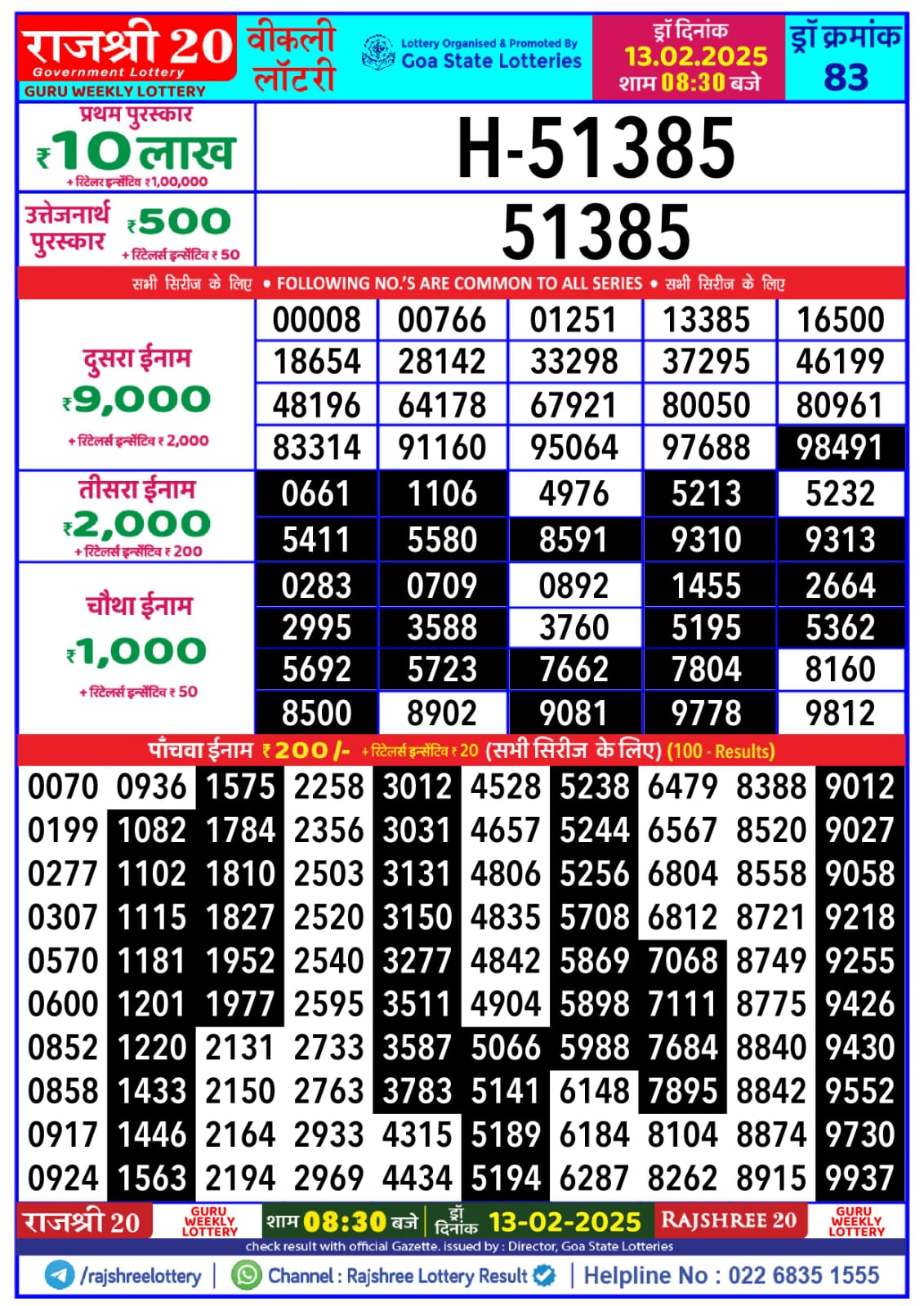 Rajshree 20 Lottery 8:30PM Result 13.2.25