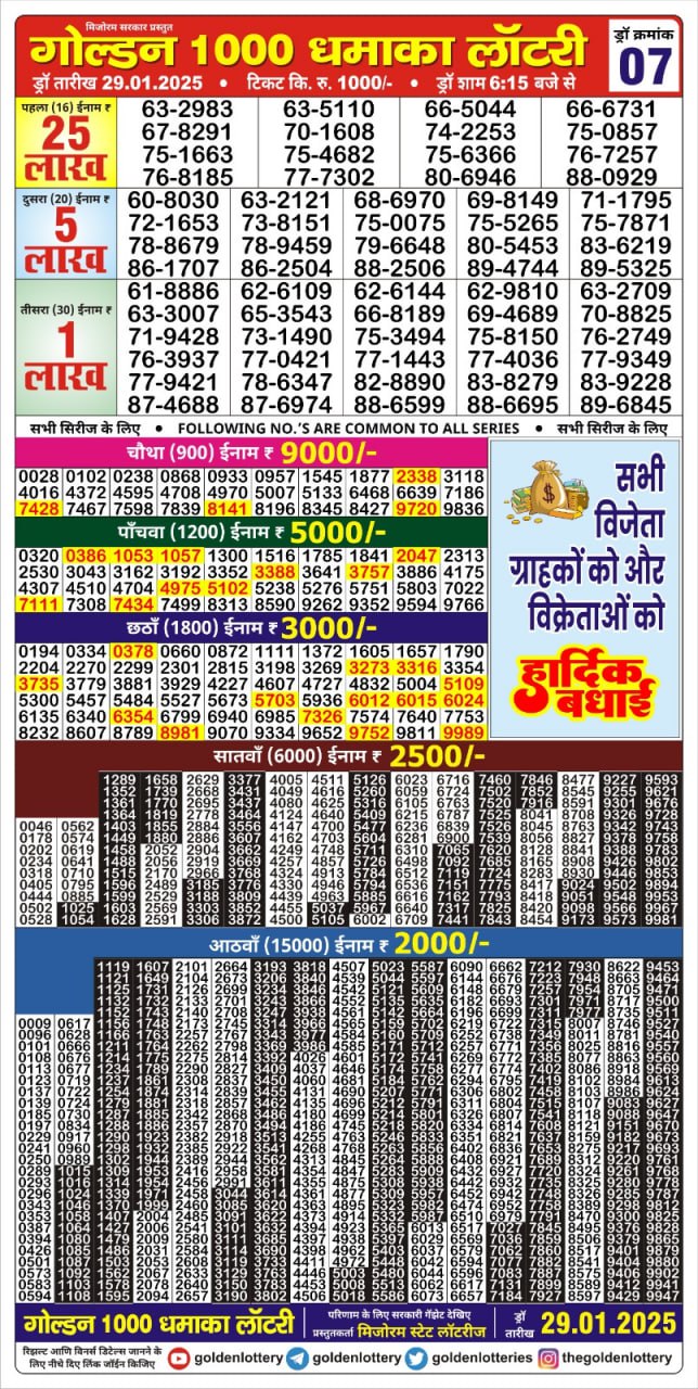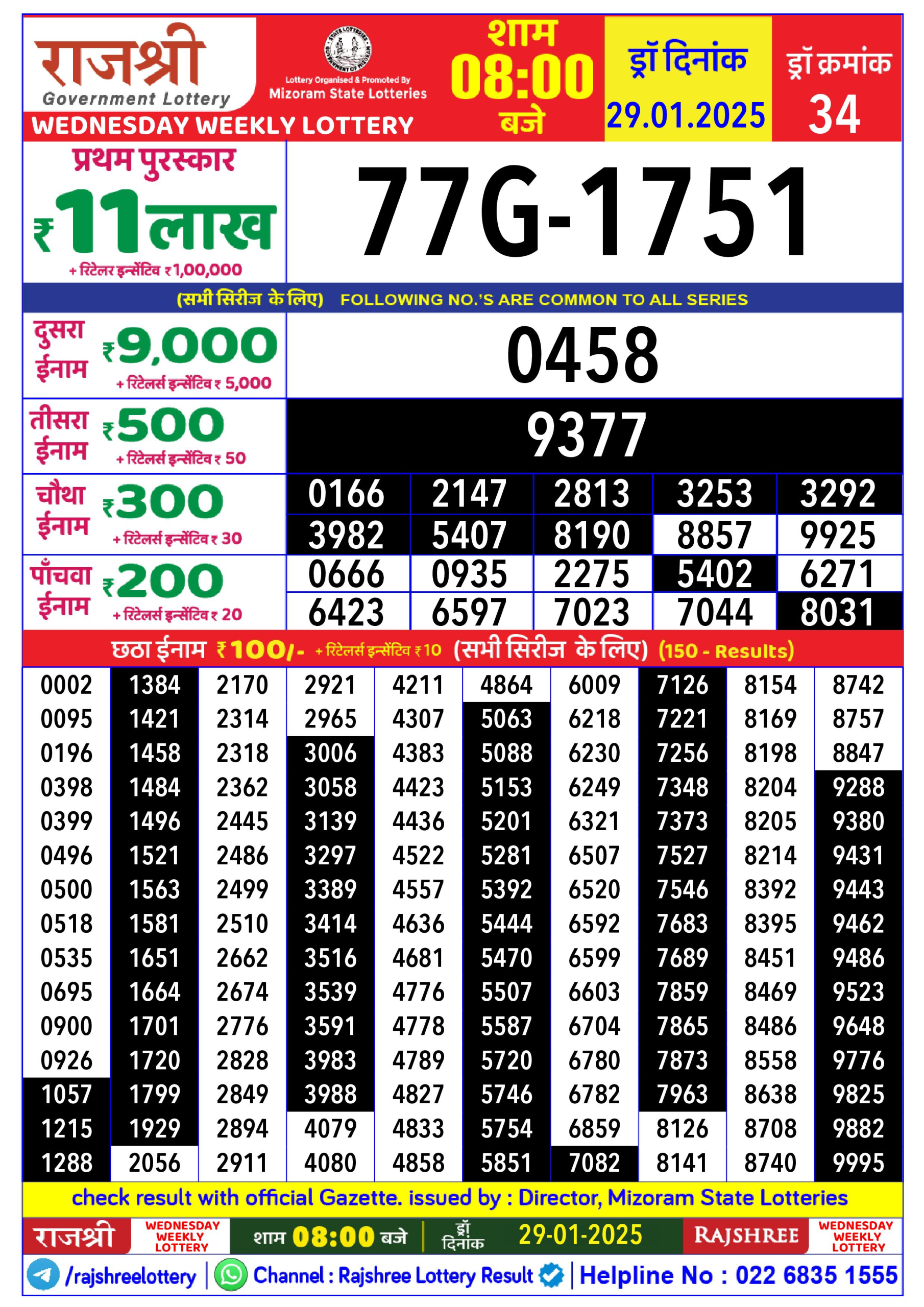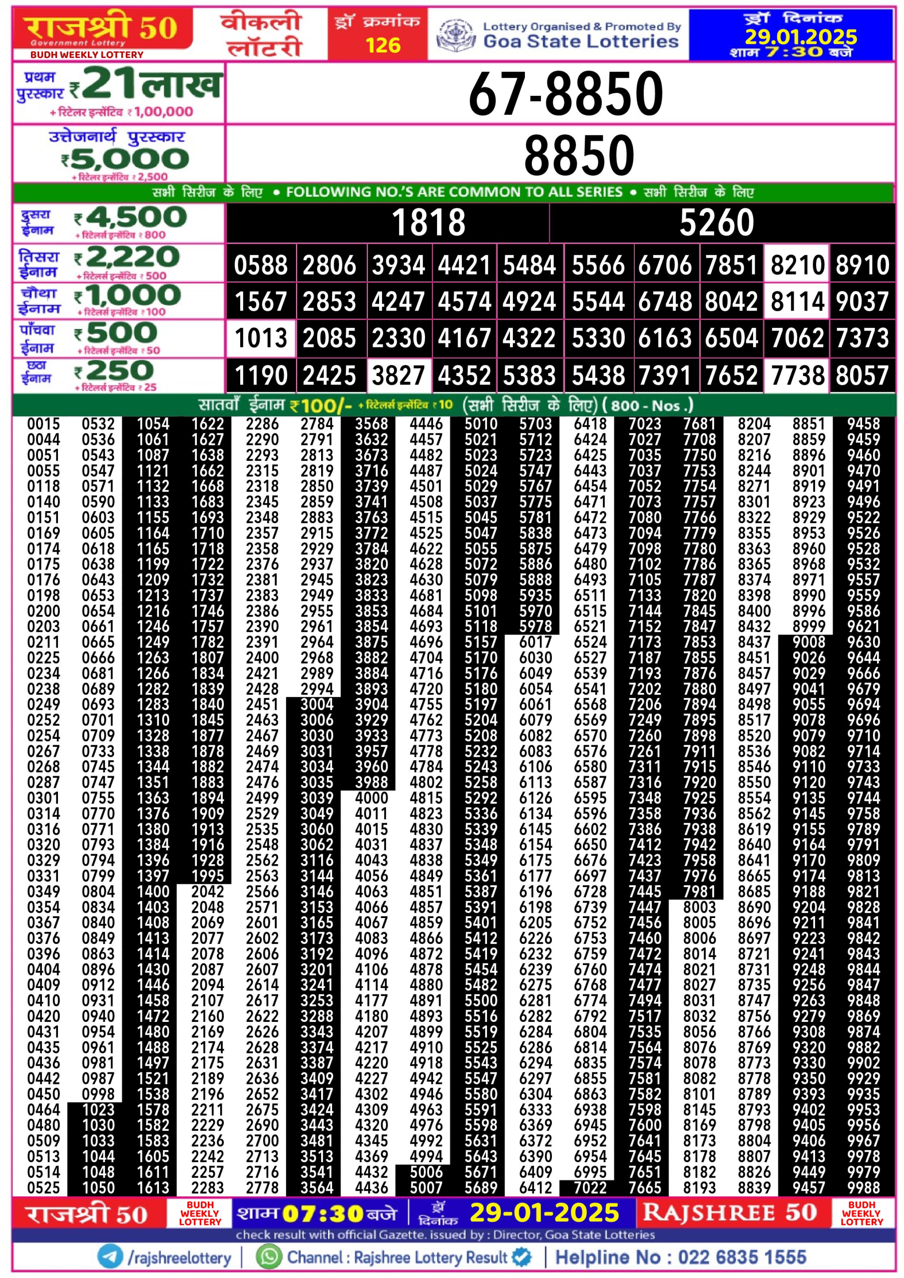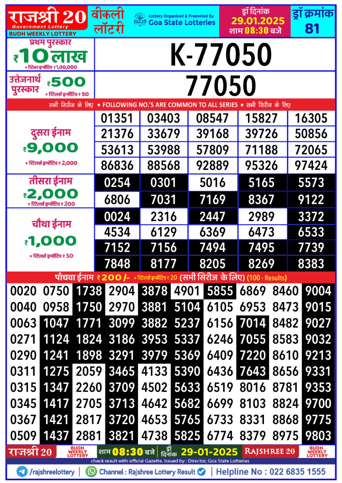 Rajshree 50 Lottery 7:30PM Result 29.1.25
