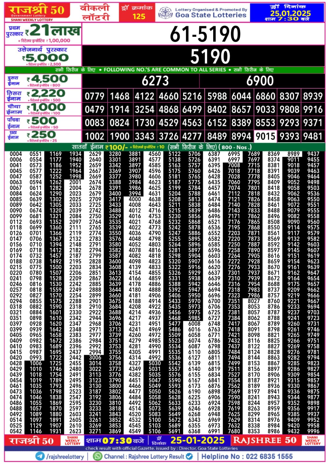 Rajshree 50 Lottery 7:30PM Result 5.1.25