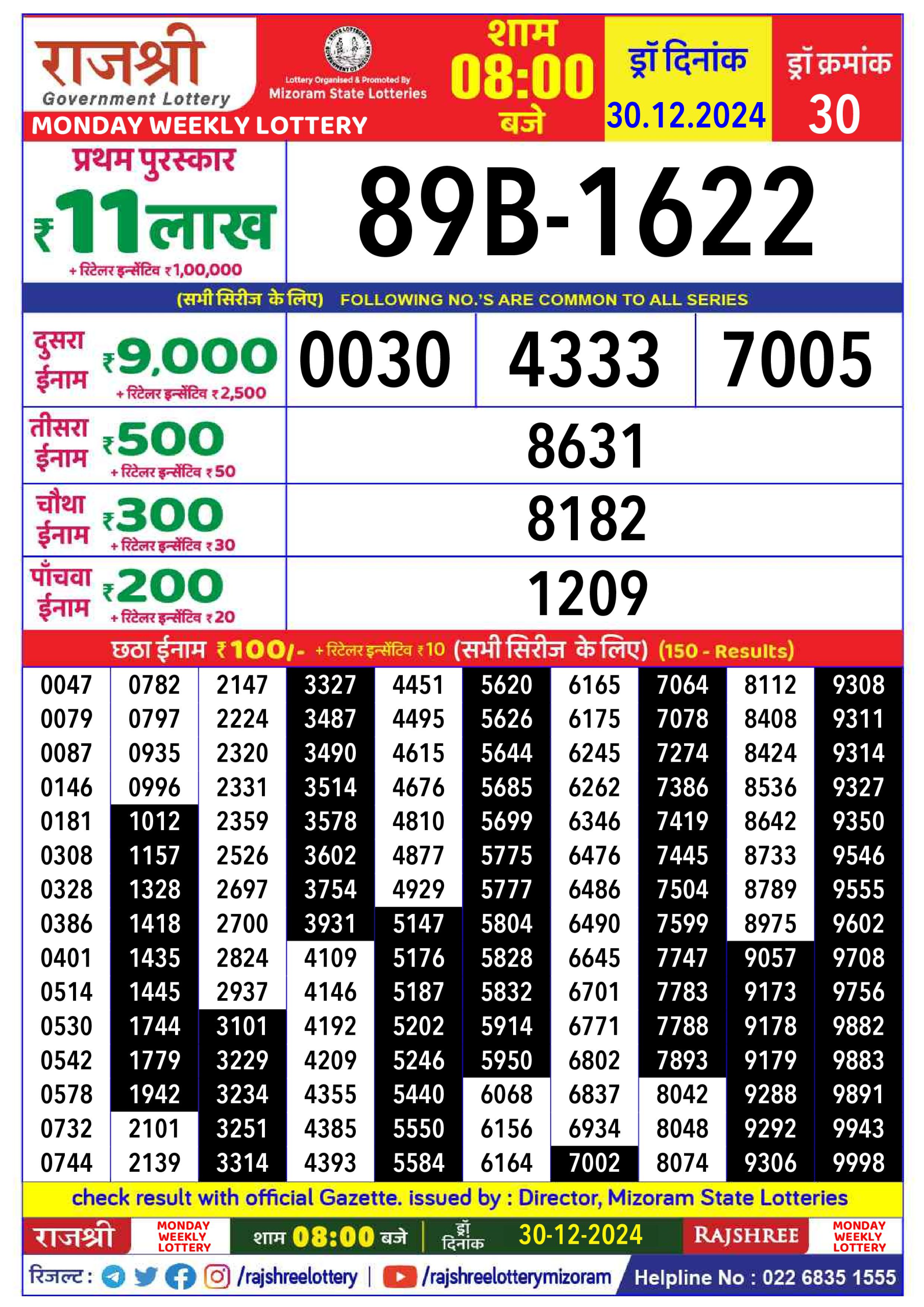 Rajshree 20 Lottery 8:30PM Result 24.1.2025
