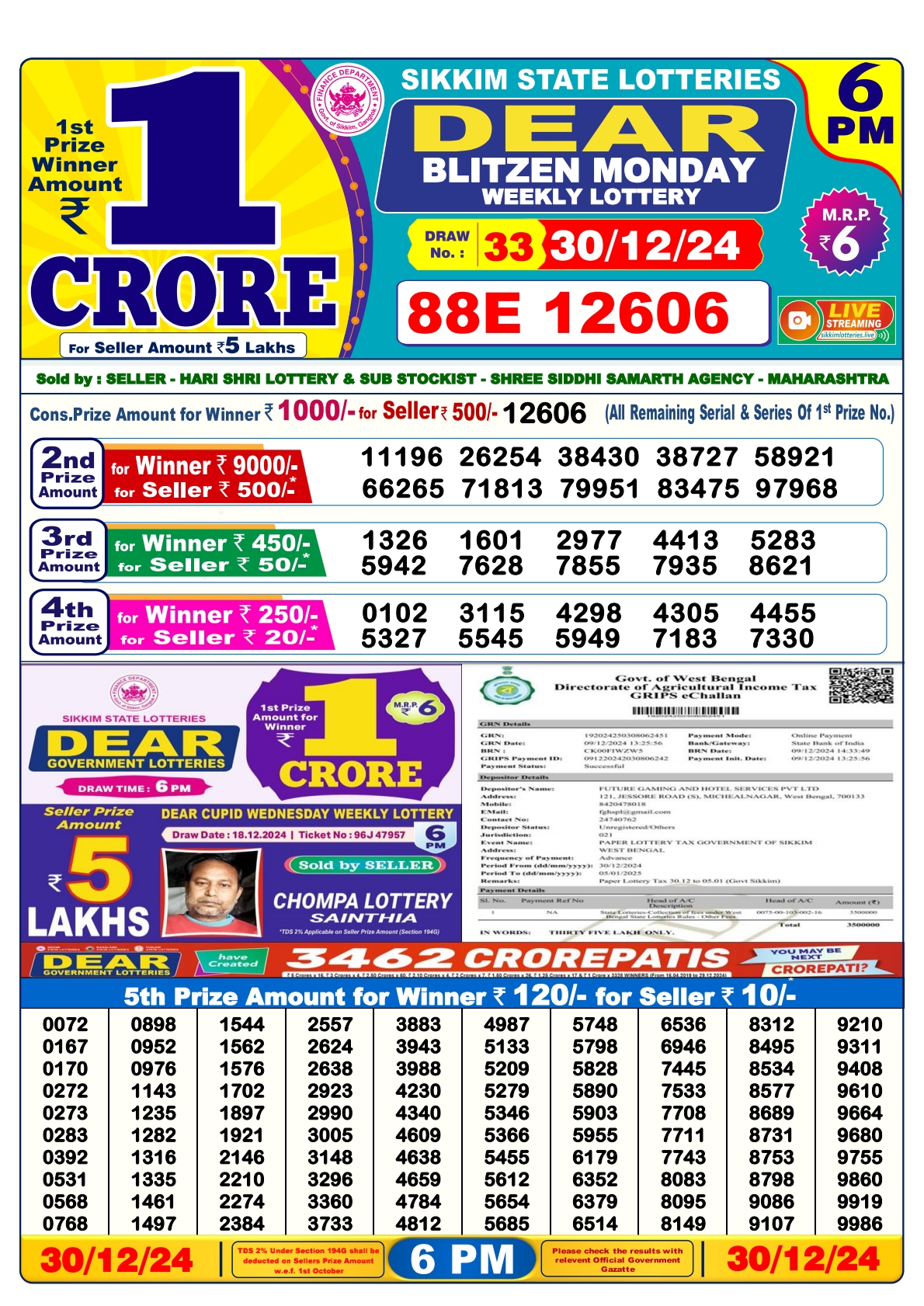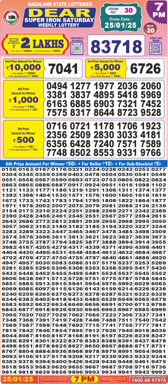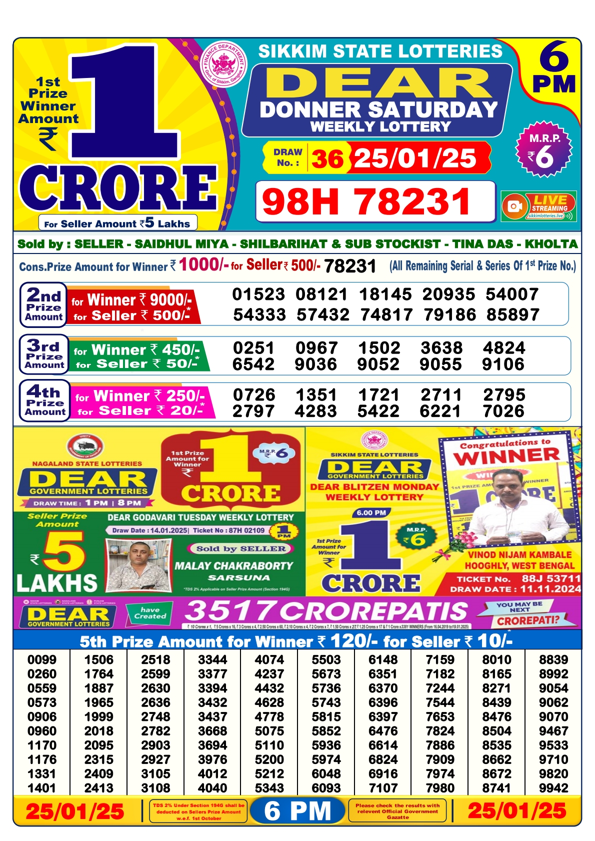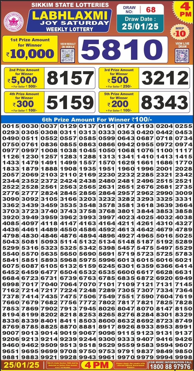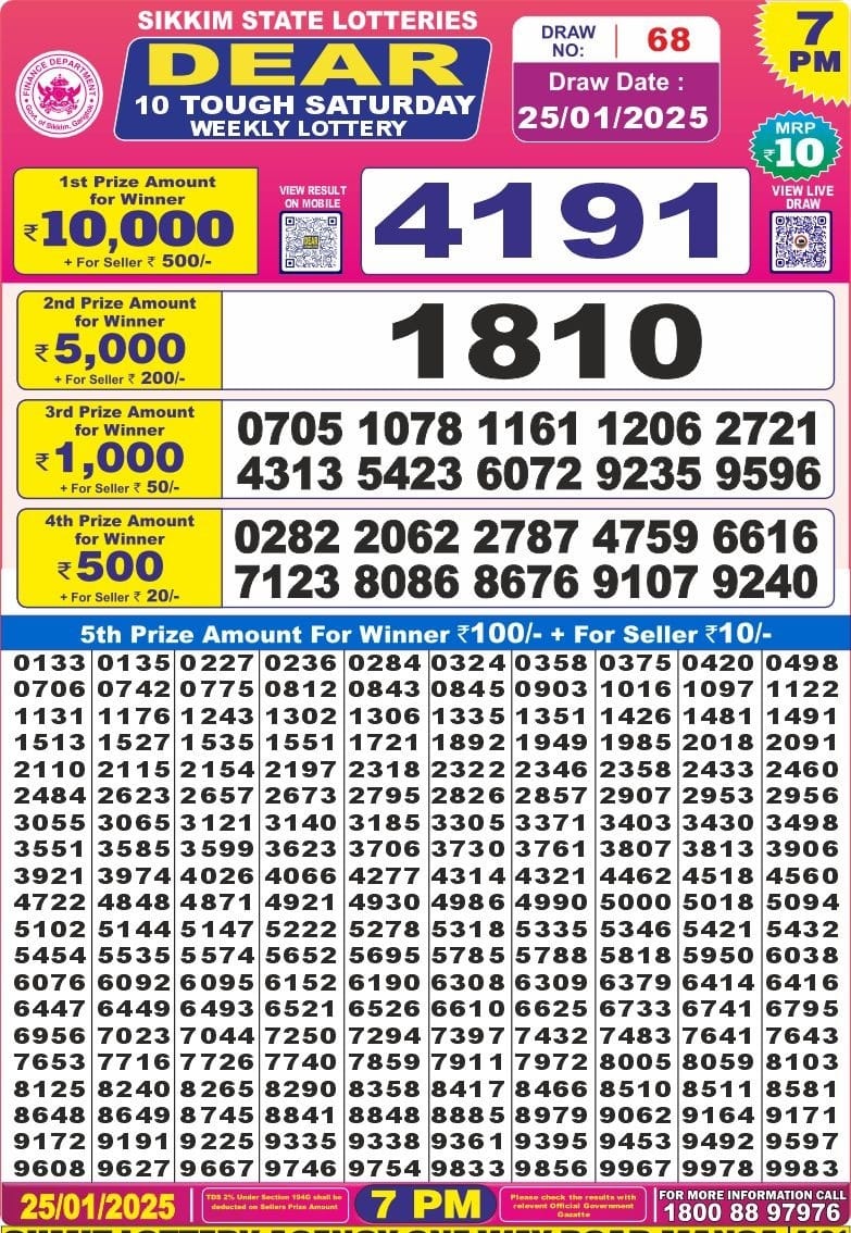 Dear 10 yellow lottery 1.30PM Result 25.1.25