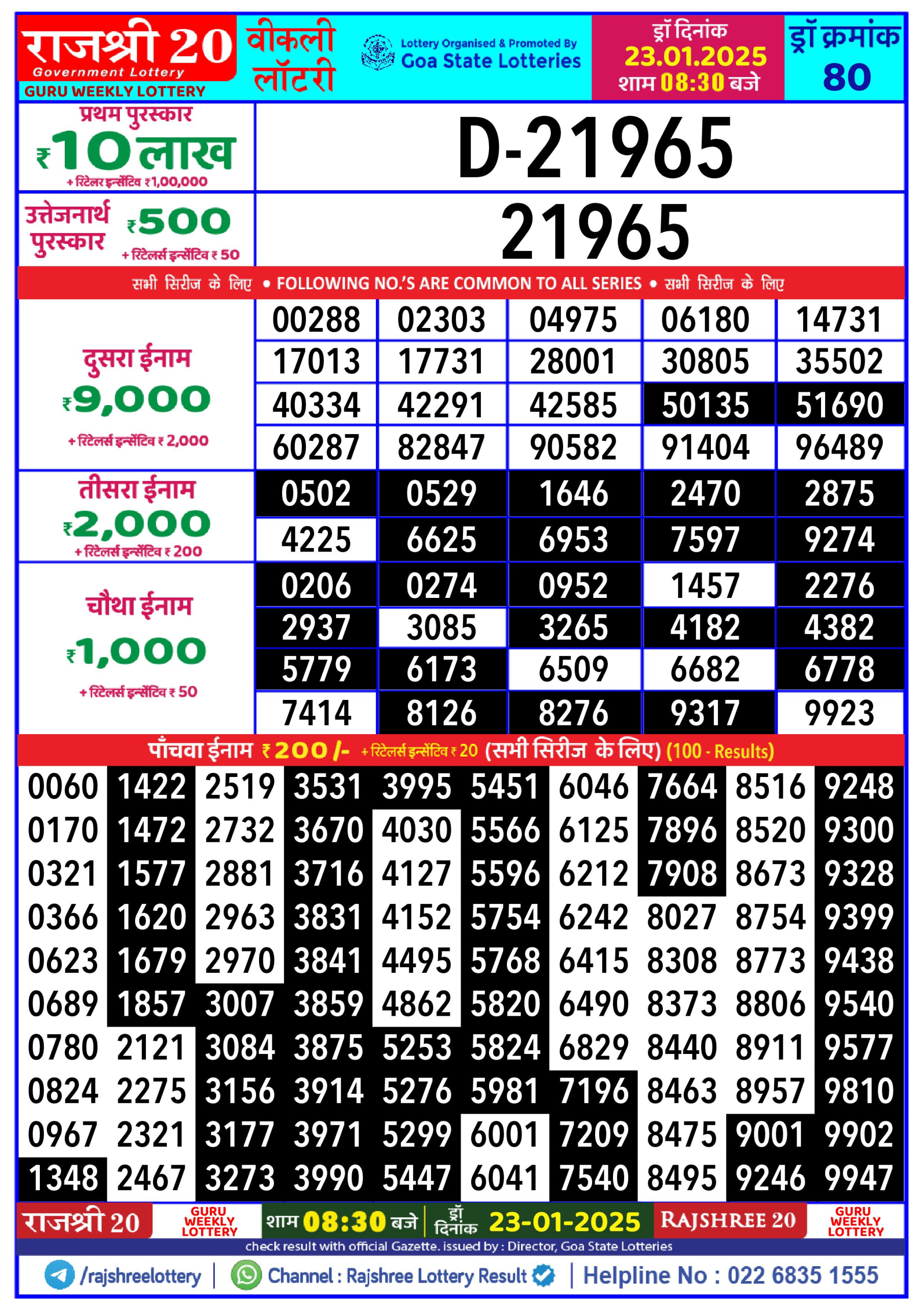 Rajshree 20 Lottery 8:30PM Result 23.1.25