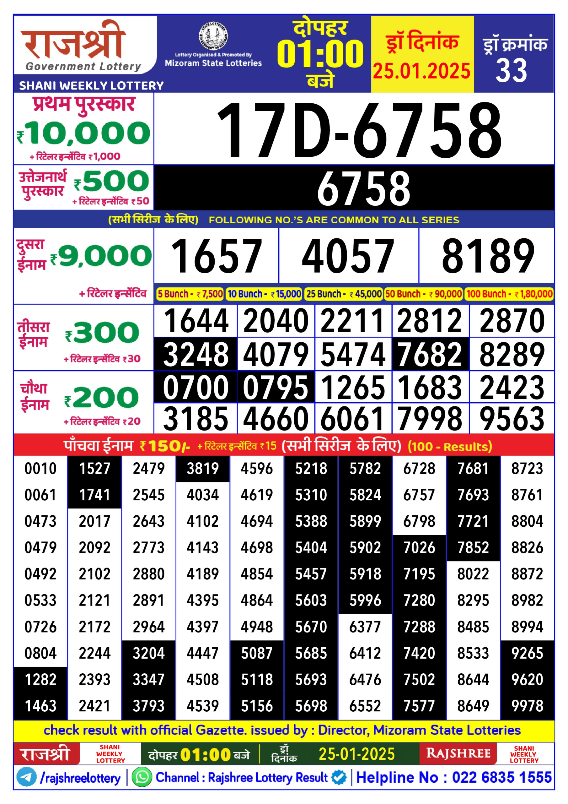 Rajshree shani Weekly Lottery 1PM Result 25.1.25