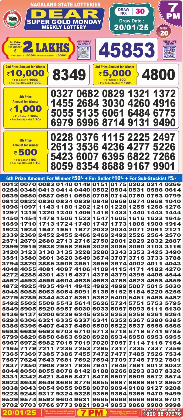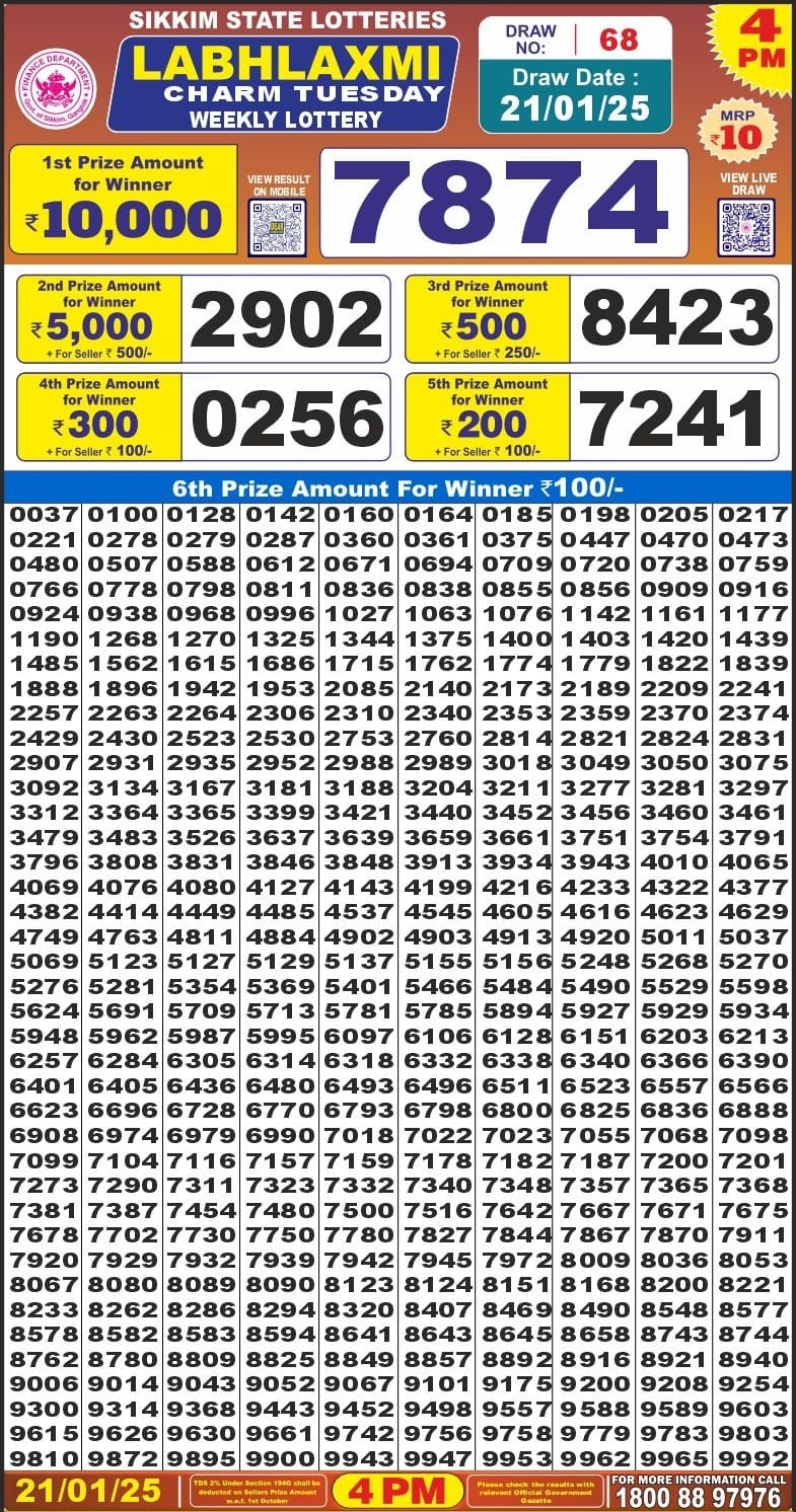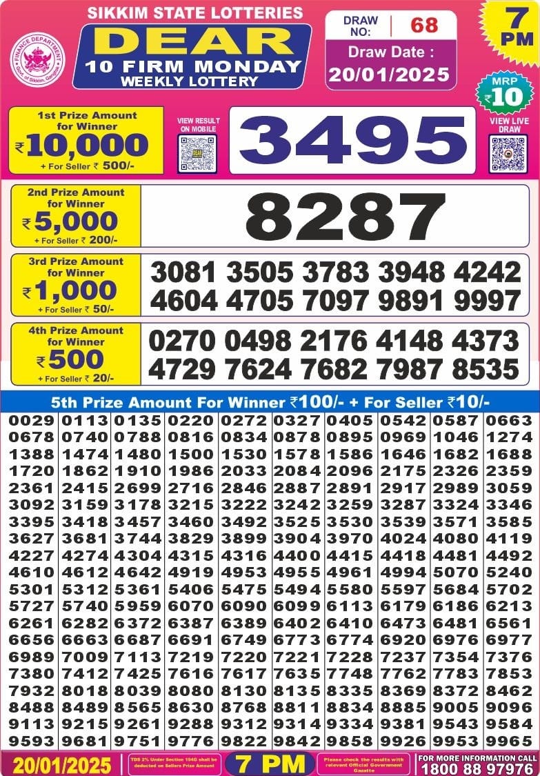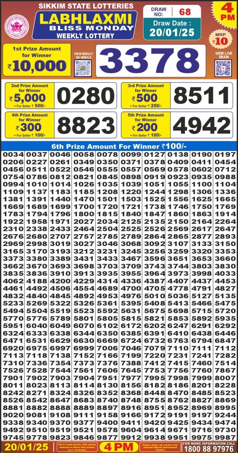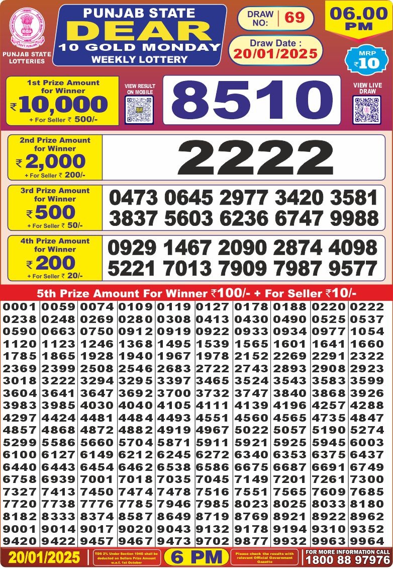 Dear 10 blue lottery 1.30PM Result 20.1.25