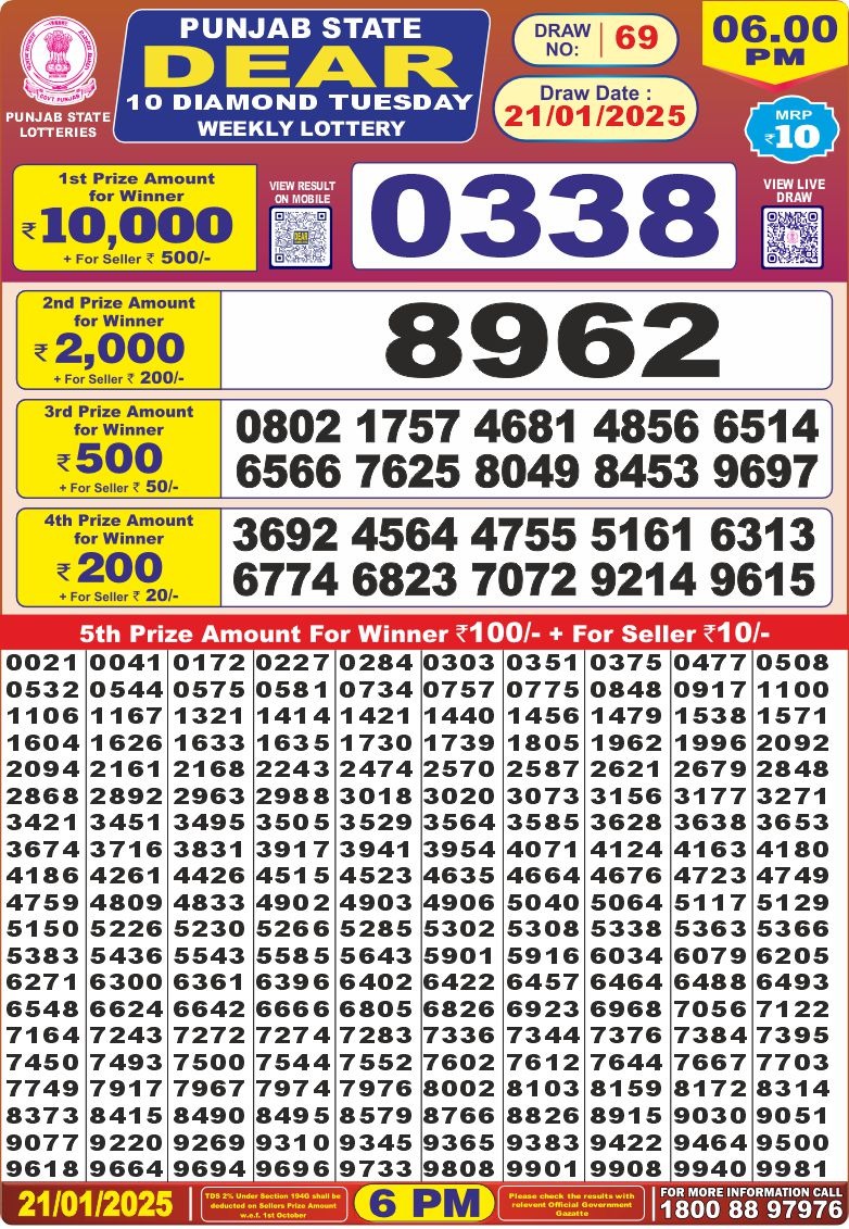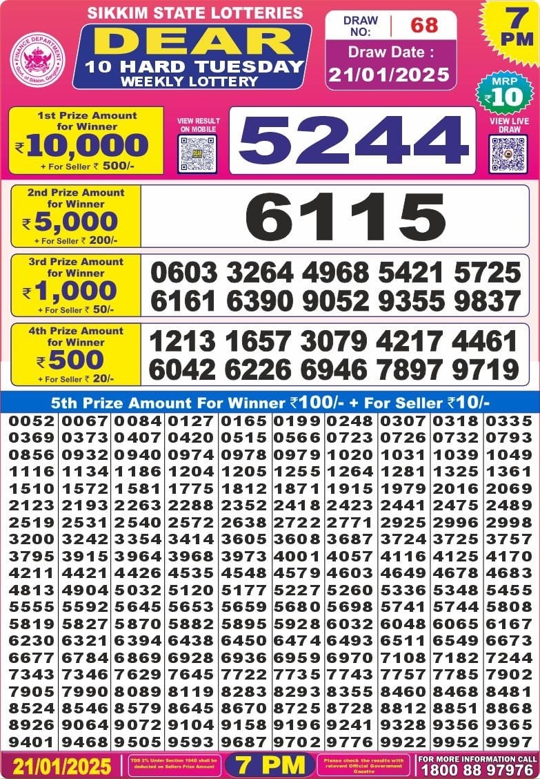 Dear 10 green lottery 1.30PM Result 21.1.25