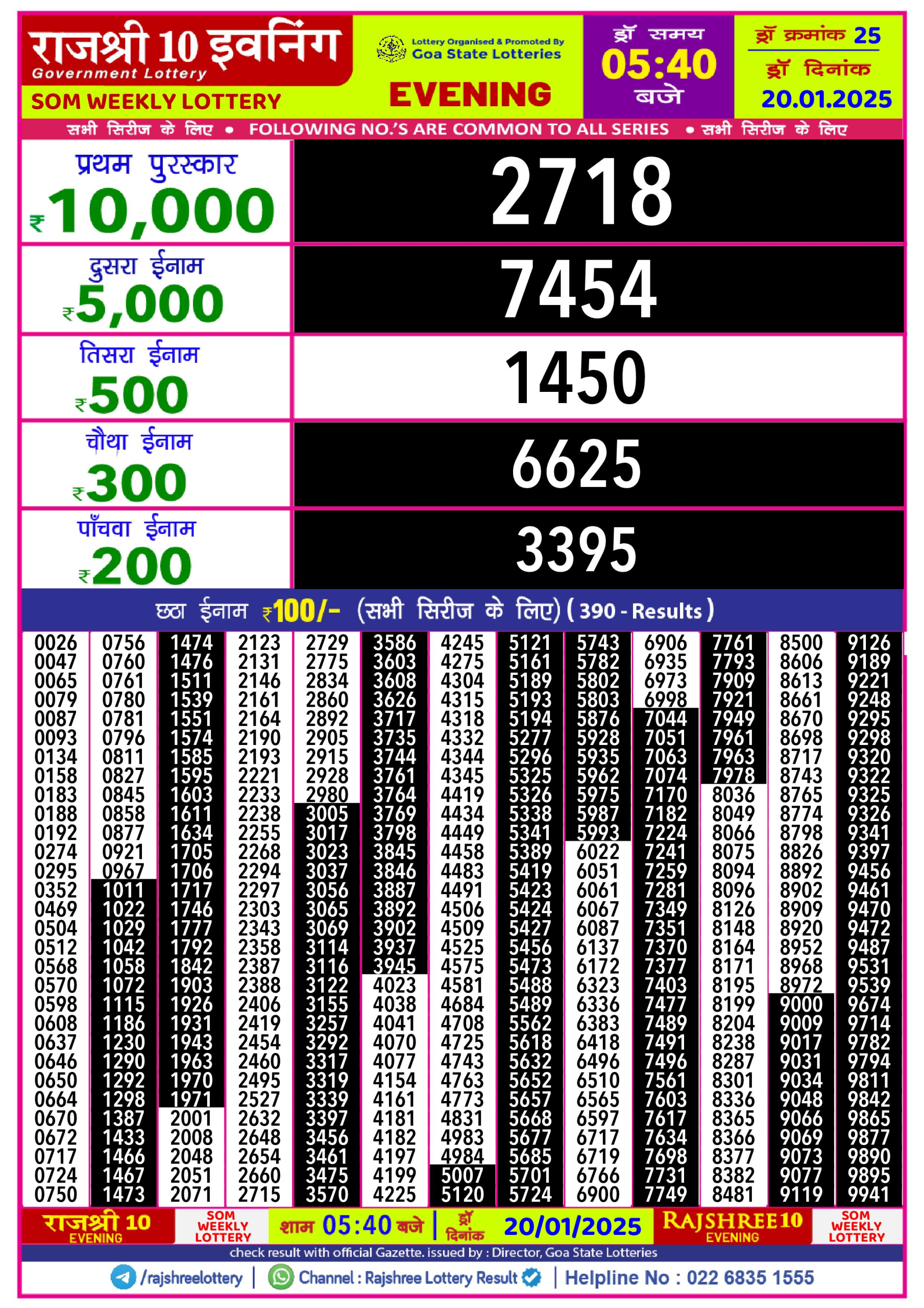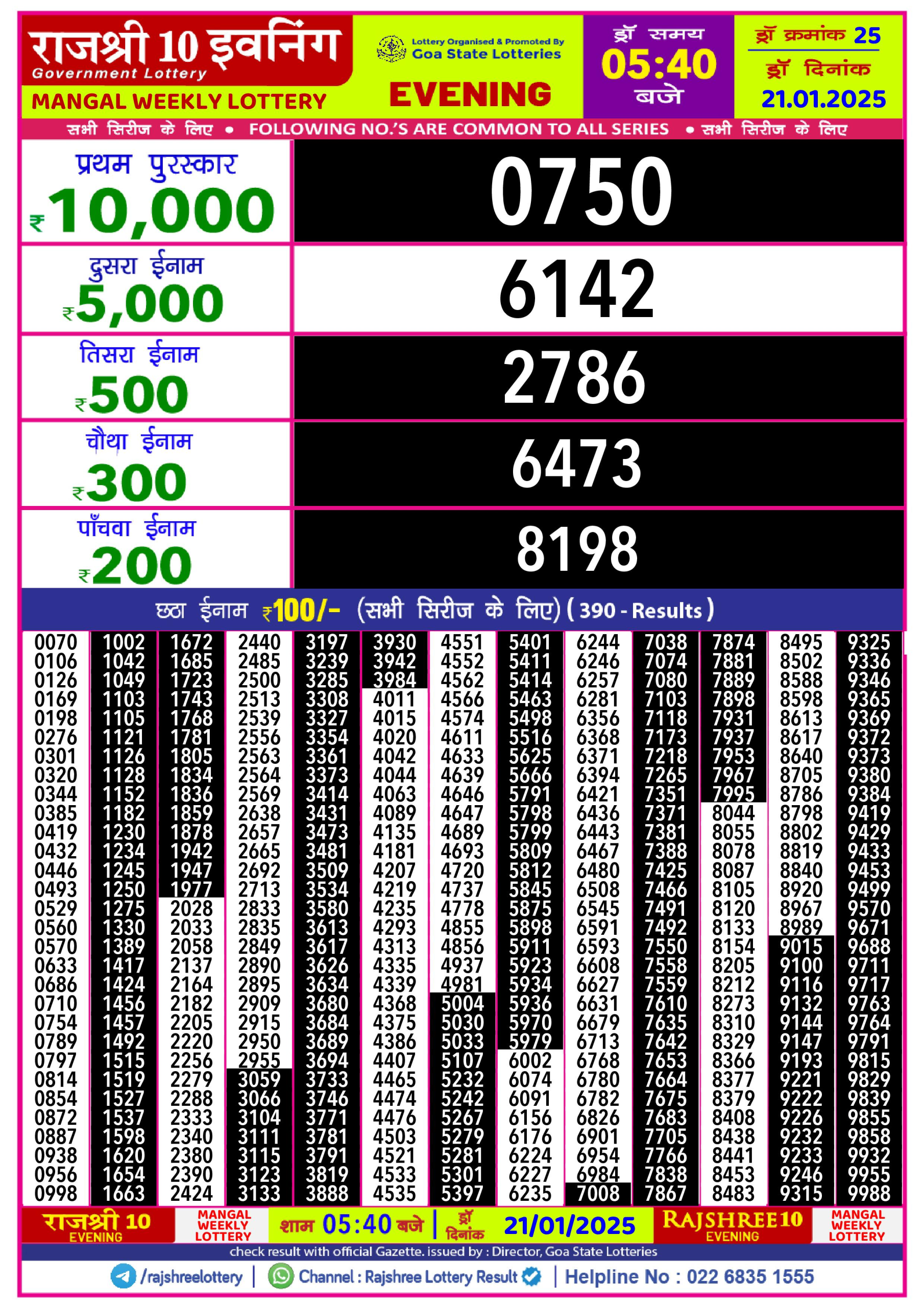 Rajshree 10 evening monday 5:40pm result 20.1.25