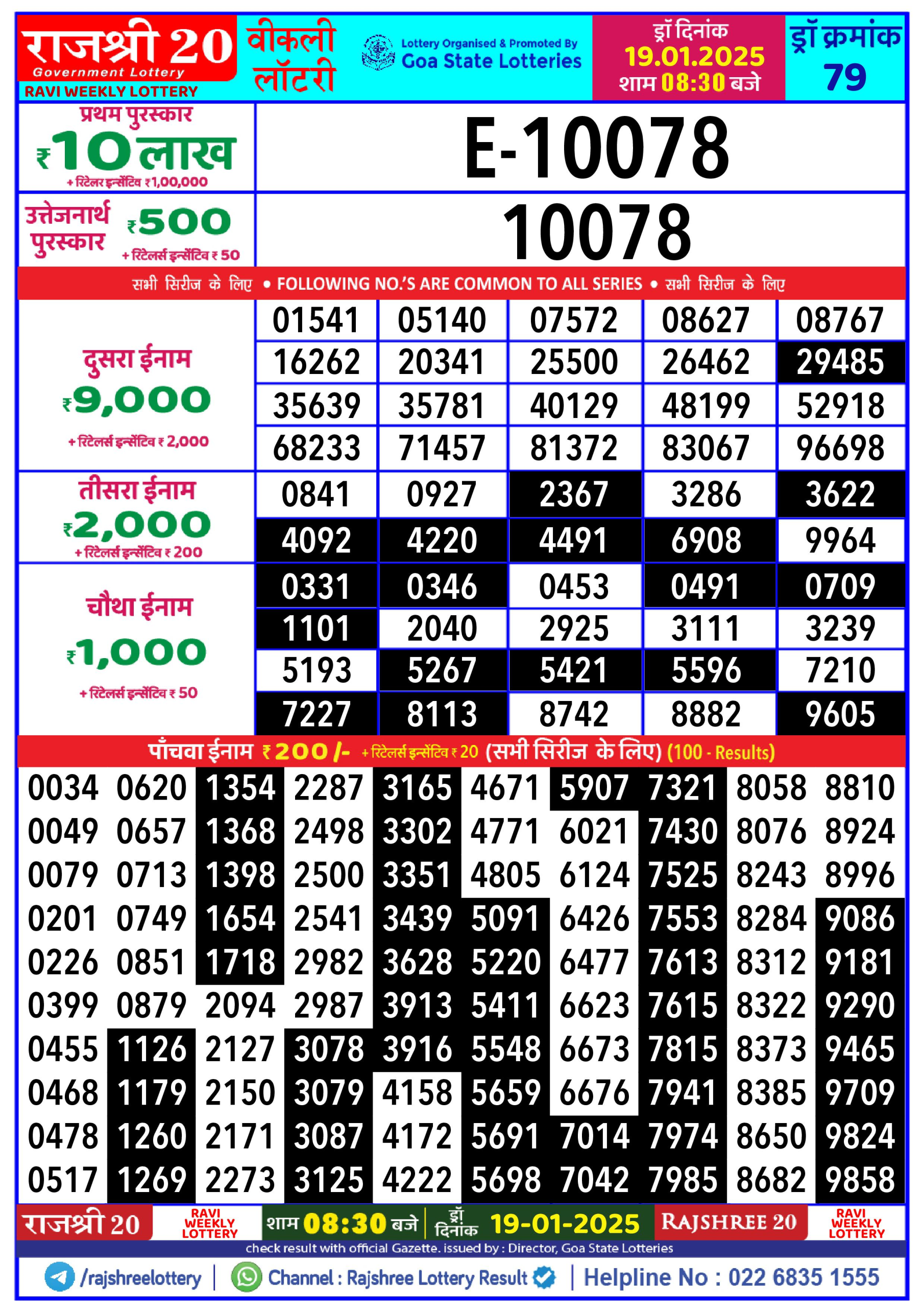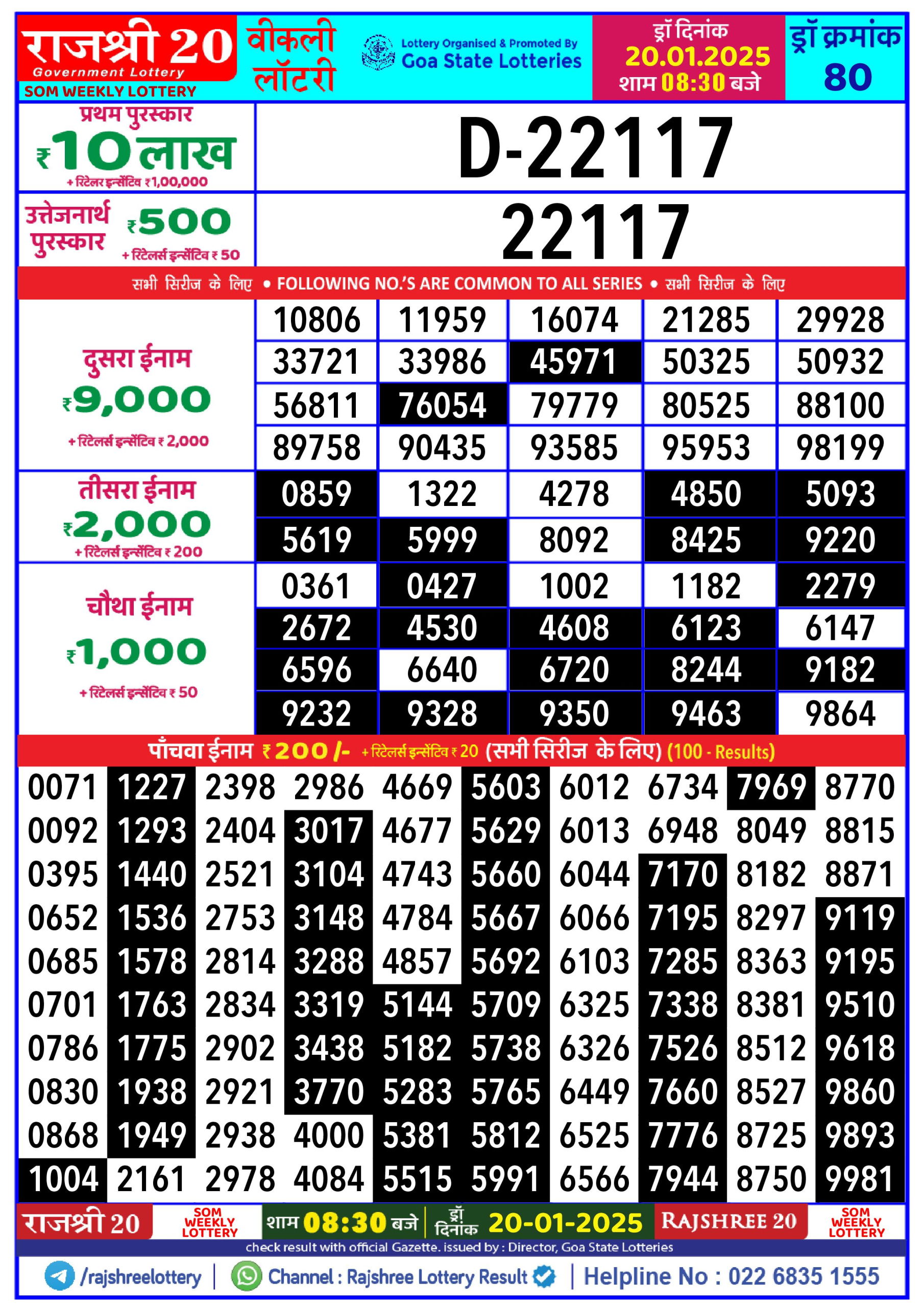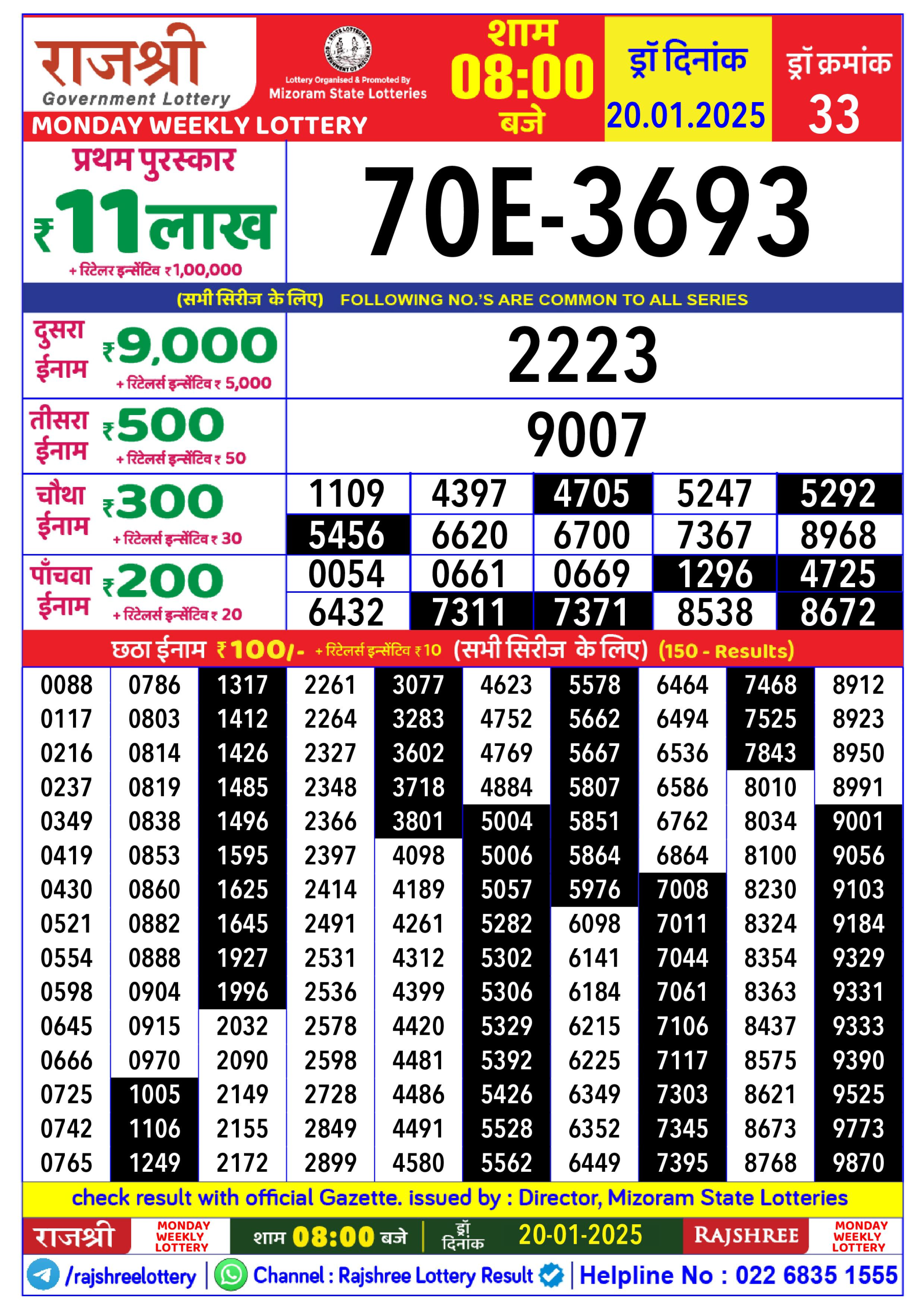 Rajshree Weekly Lottery 8PM Result 20.1.25