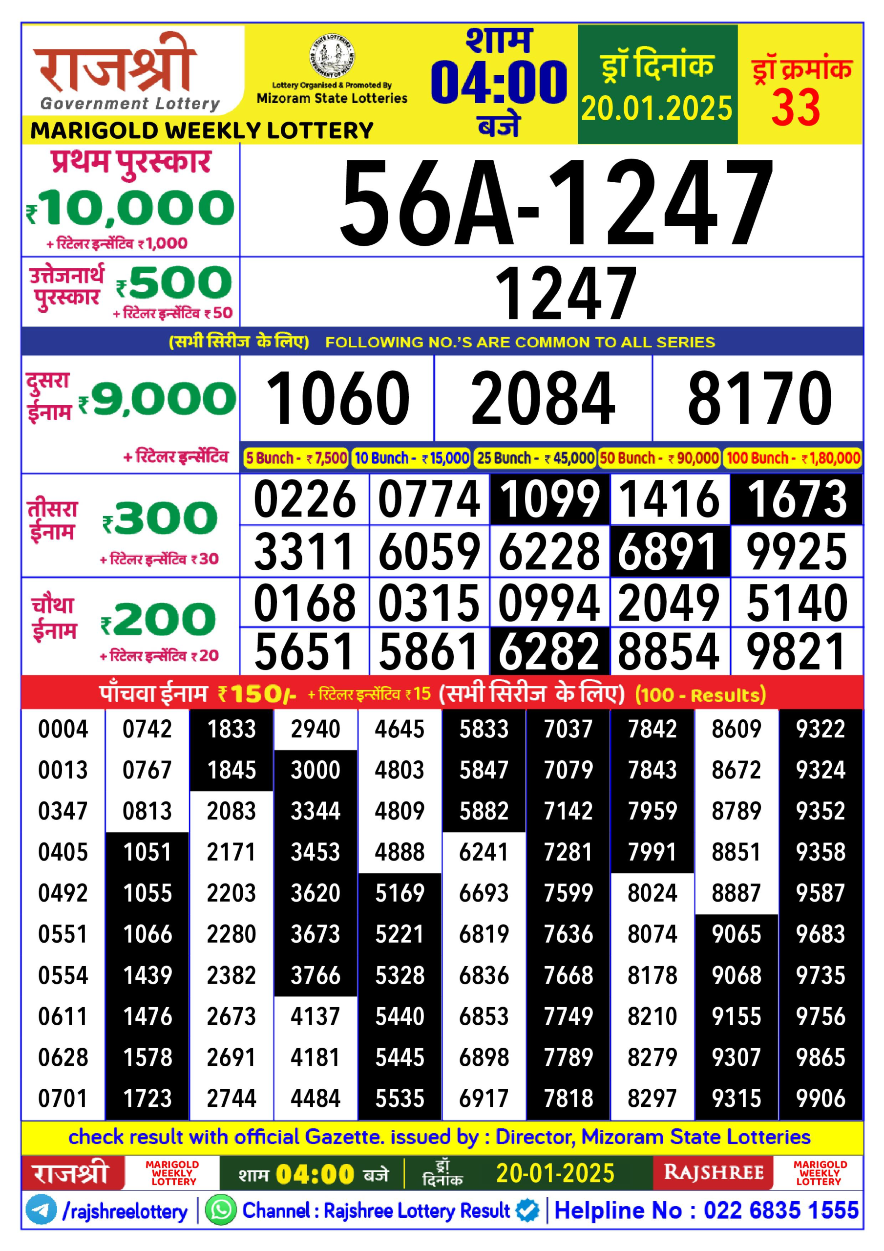 Rajshree marigold monday Weekly Lottery 4PM Result 20.1.25