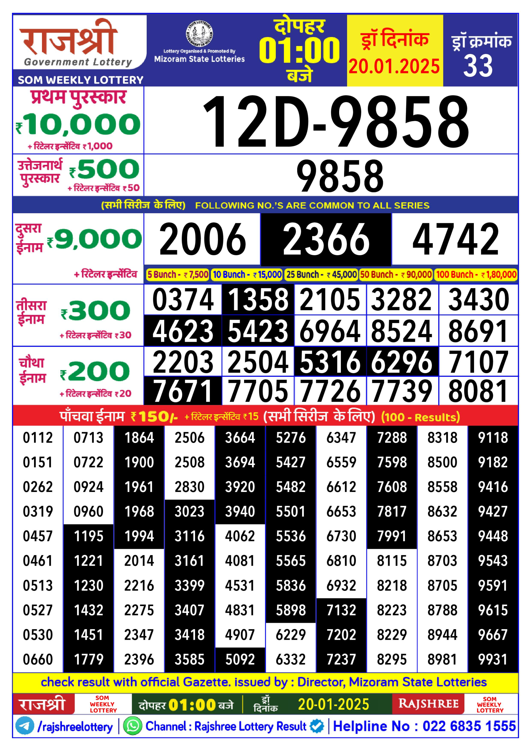 Rajshree som Weekly Lottery 1PM Result 20.1.25