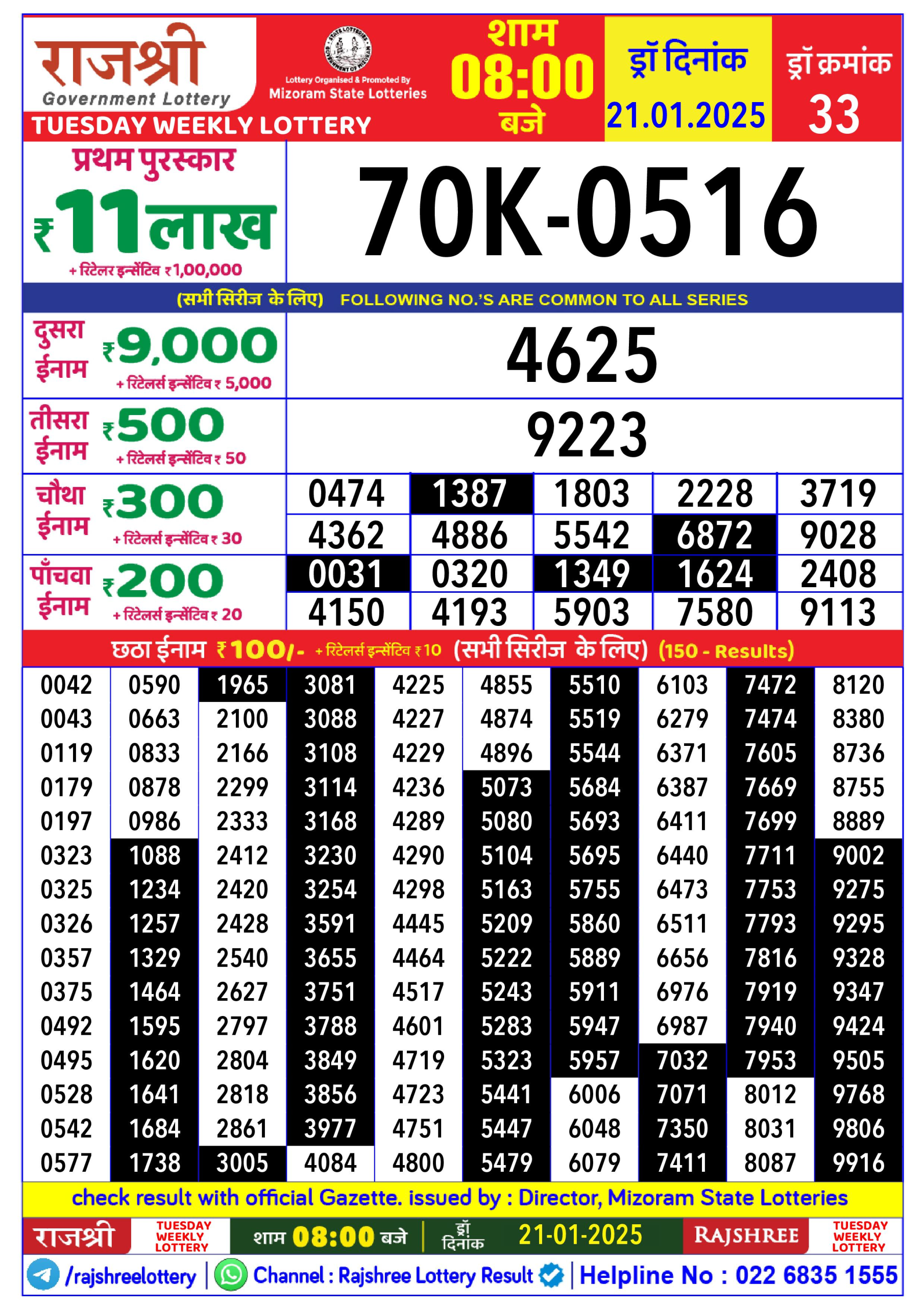 Rajshree  Weekly Lottery 8PM Result 21.1.25