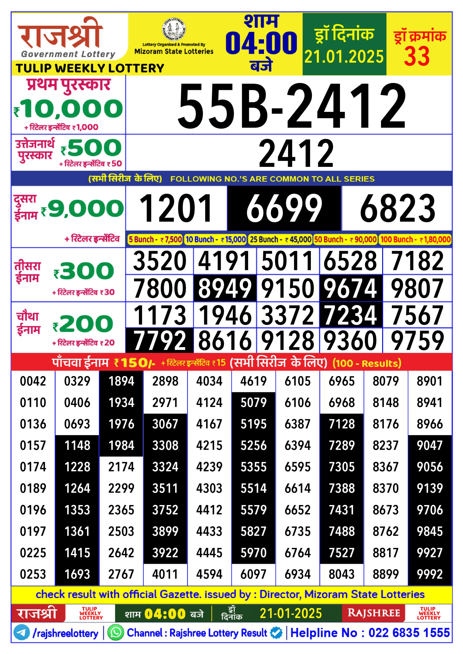 Rajshree tulip Tuesday Weekly Lottery 4PM Result 21.1.25