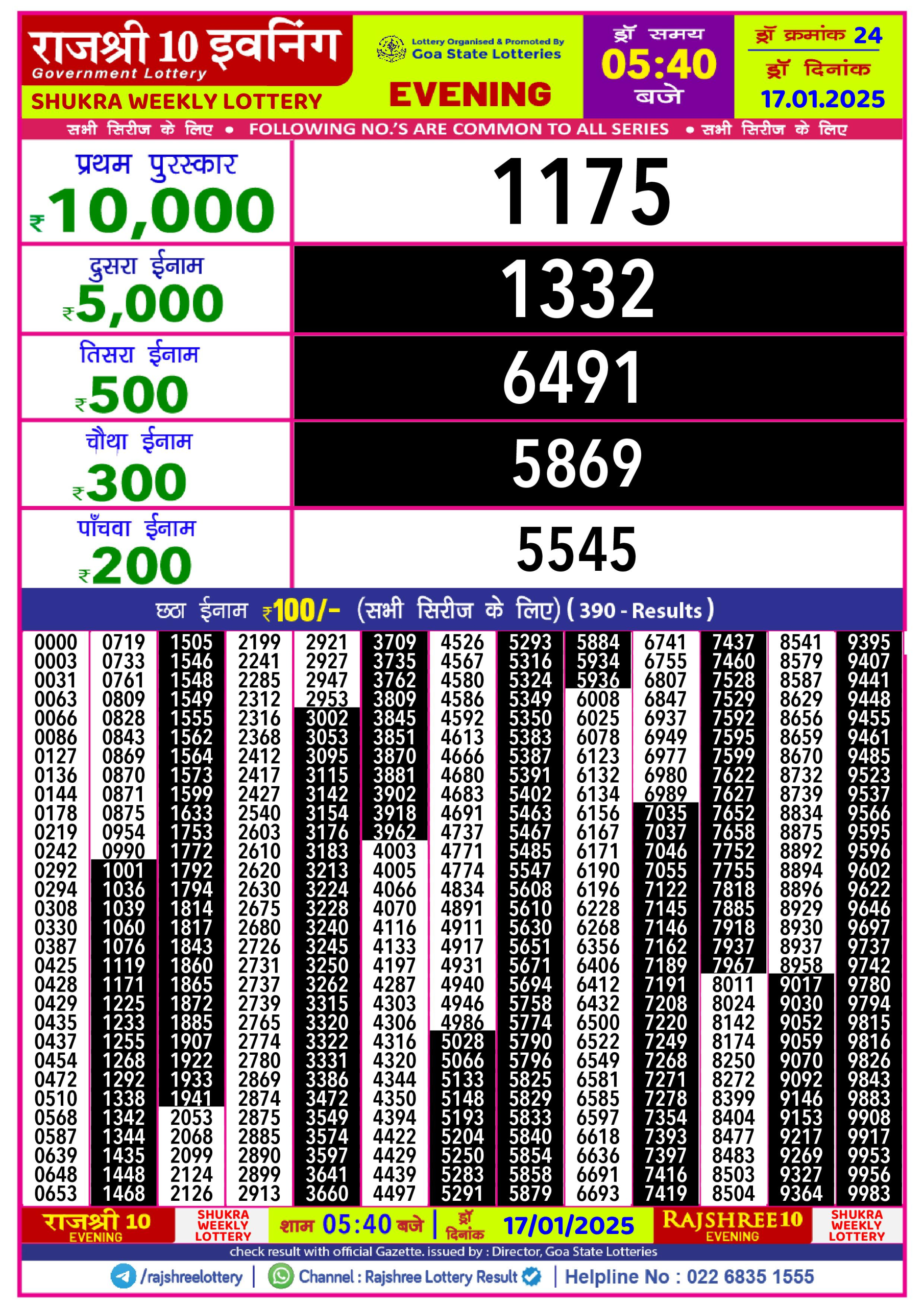 Rajshree 10 evening friday 5:40pm result 17.1.25
