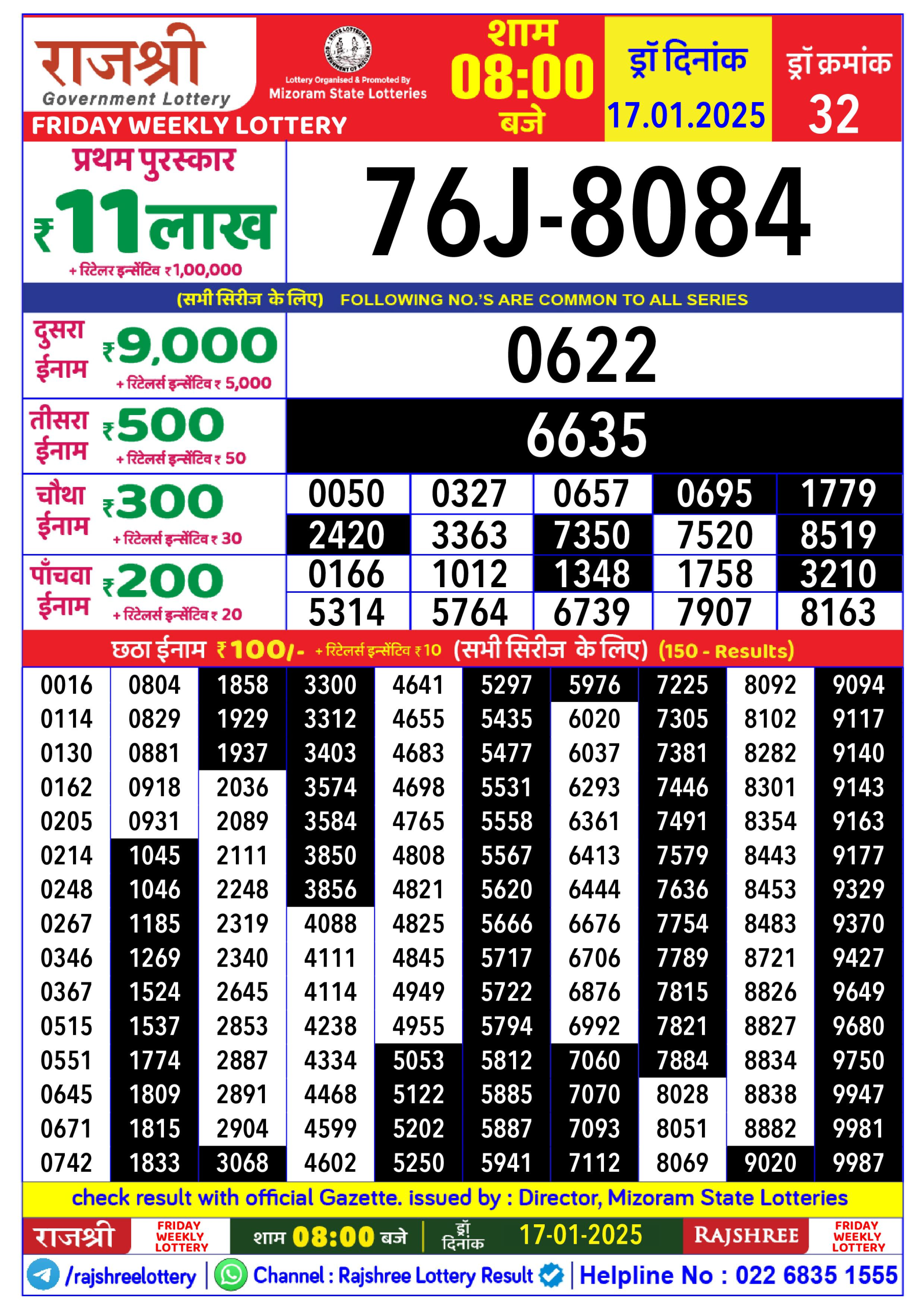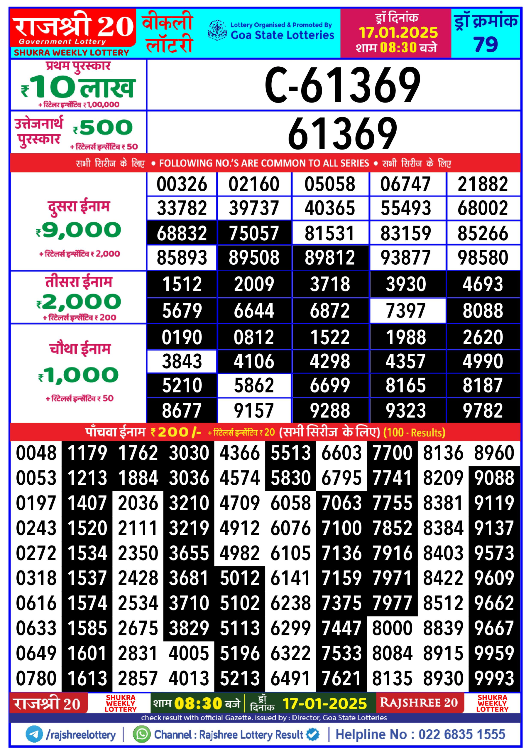 Rajshree Weekly Lottery 8PM Result 17.1.2025