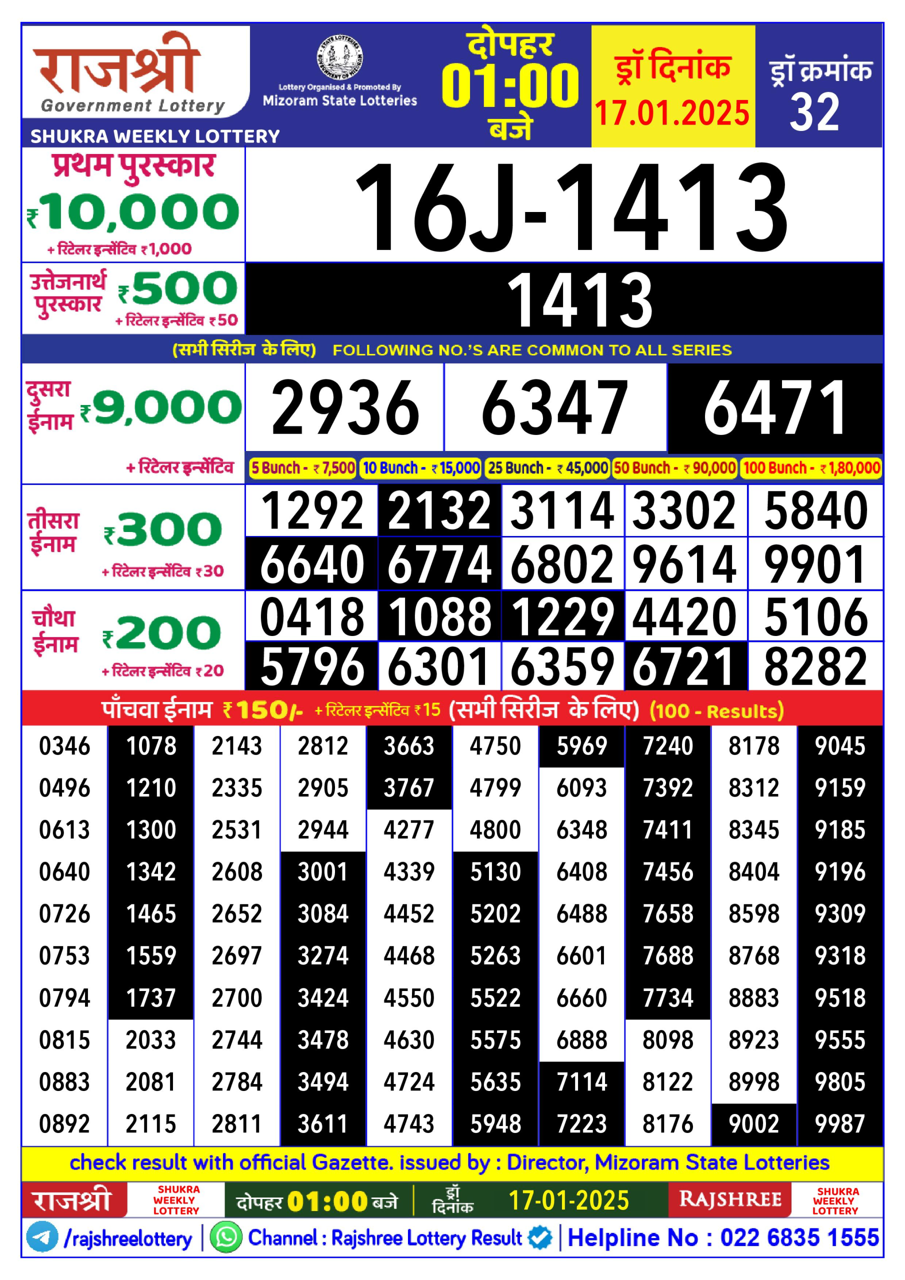 Rajshree shukra Weekly Lottery 1PM Result 17.1.25
