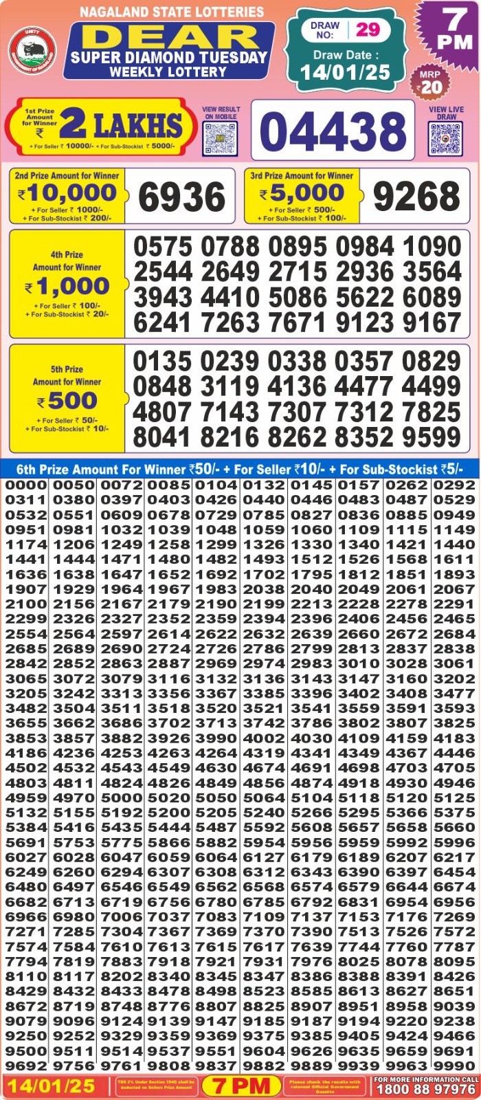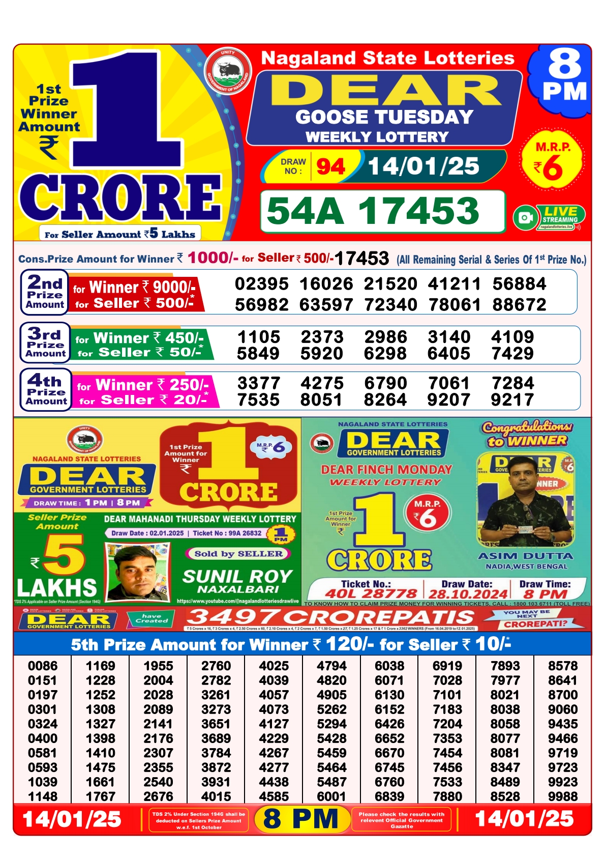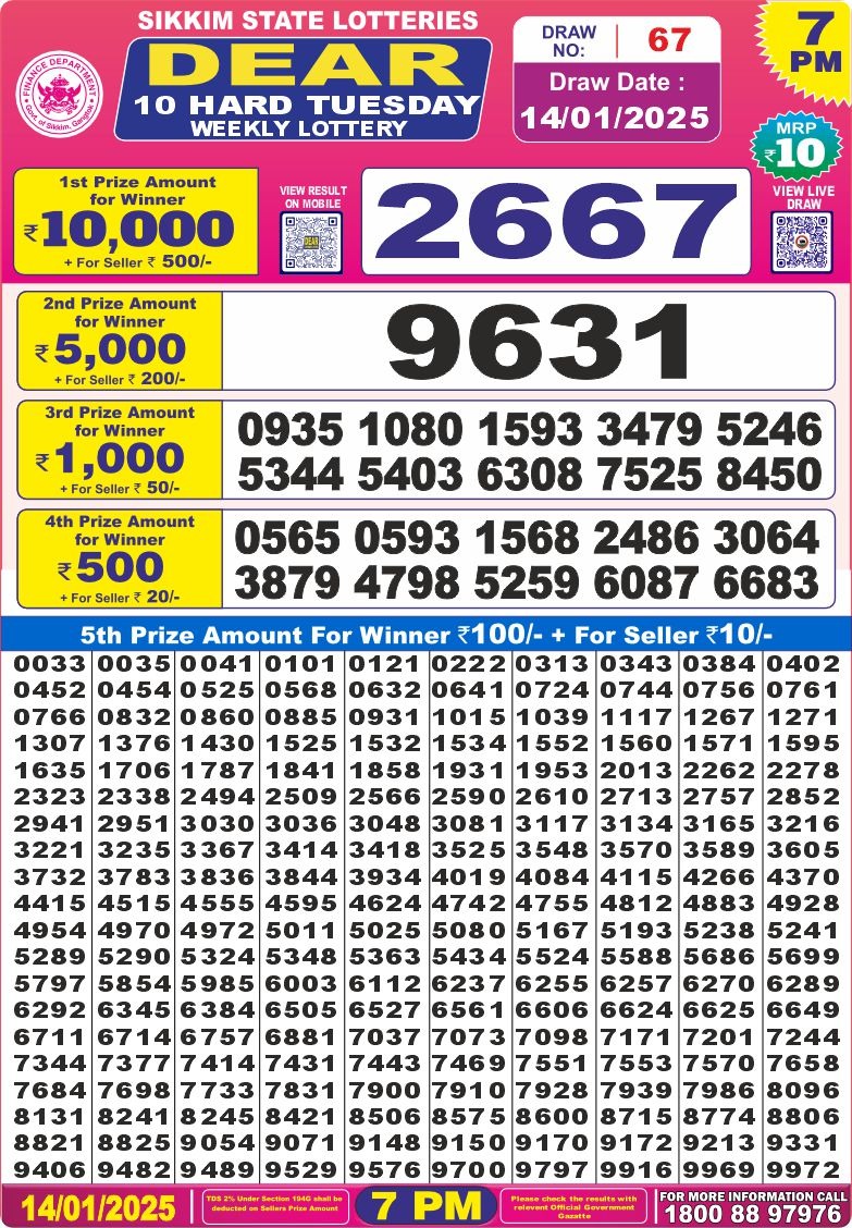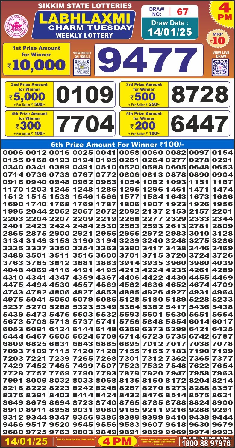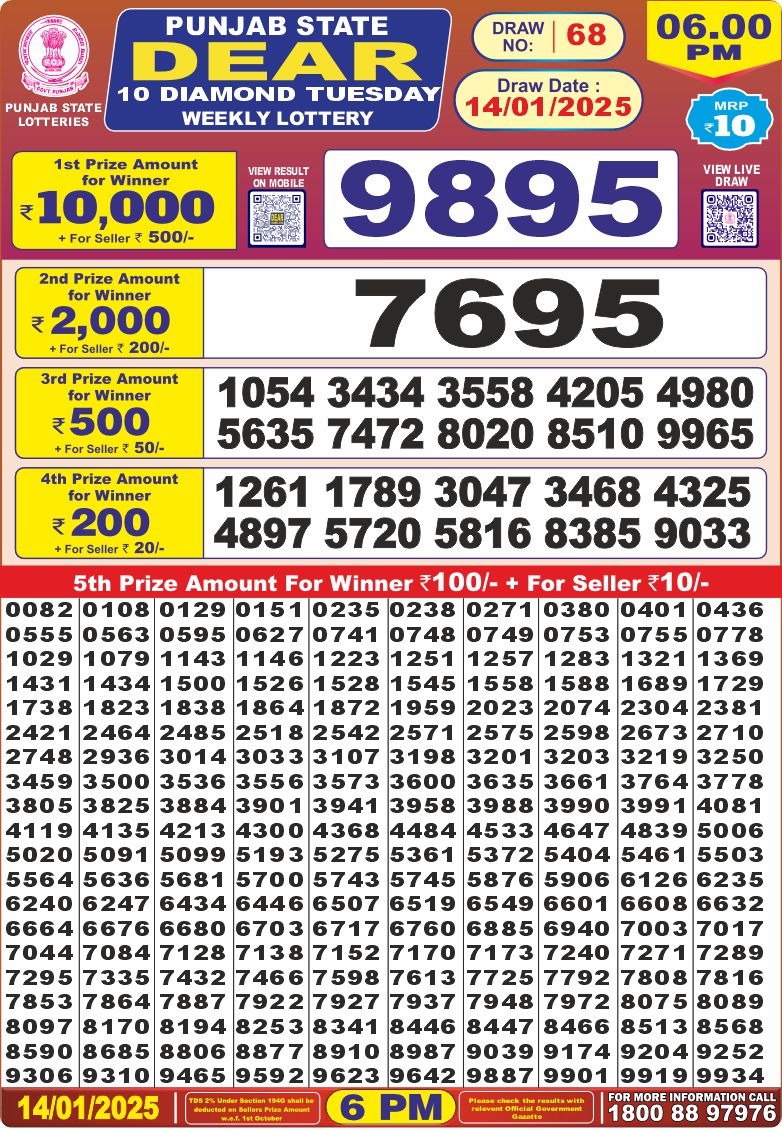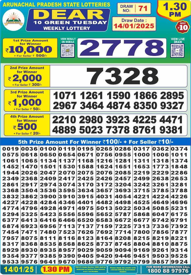 Dear 10 green lottery 1.30PM Result 14.1.25