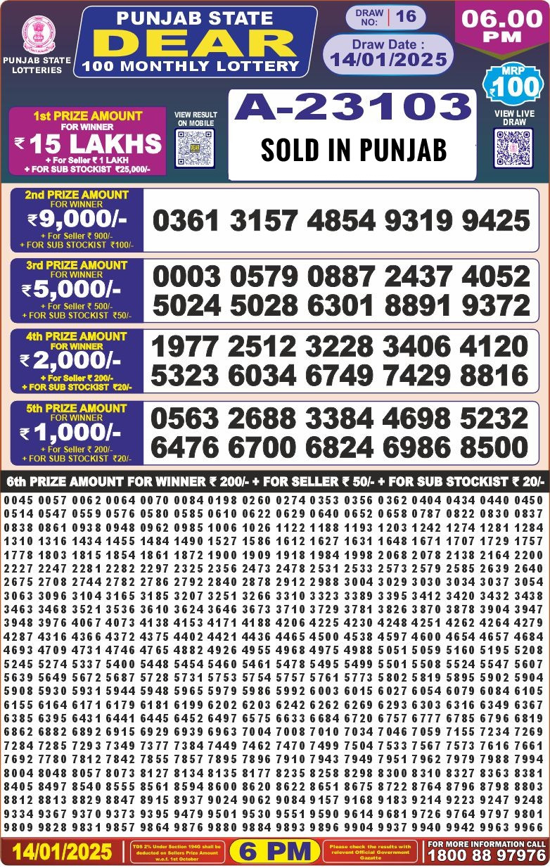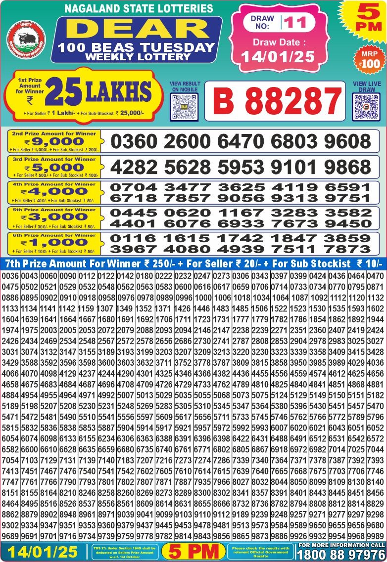Dear 100 beas tuesday Lottery 5pm Result  14.1.25