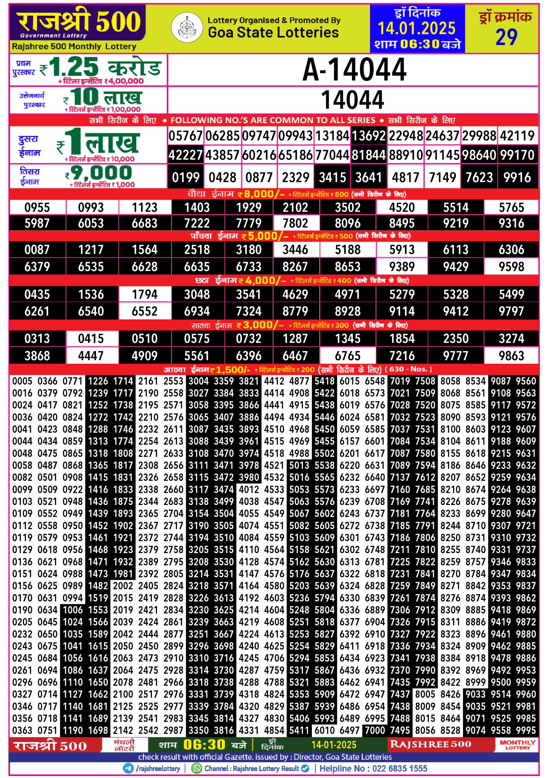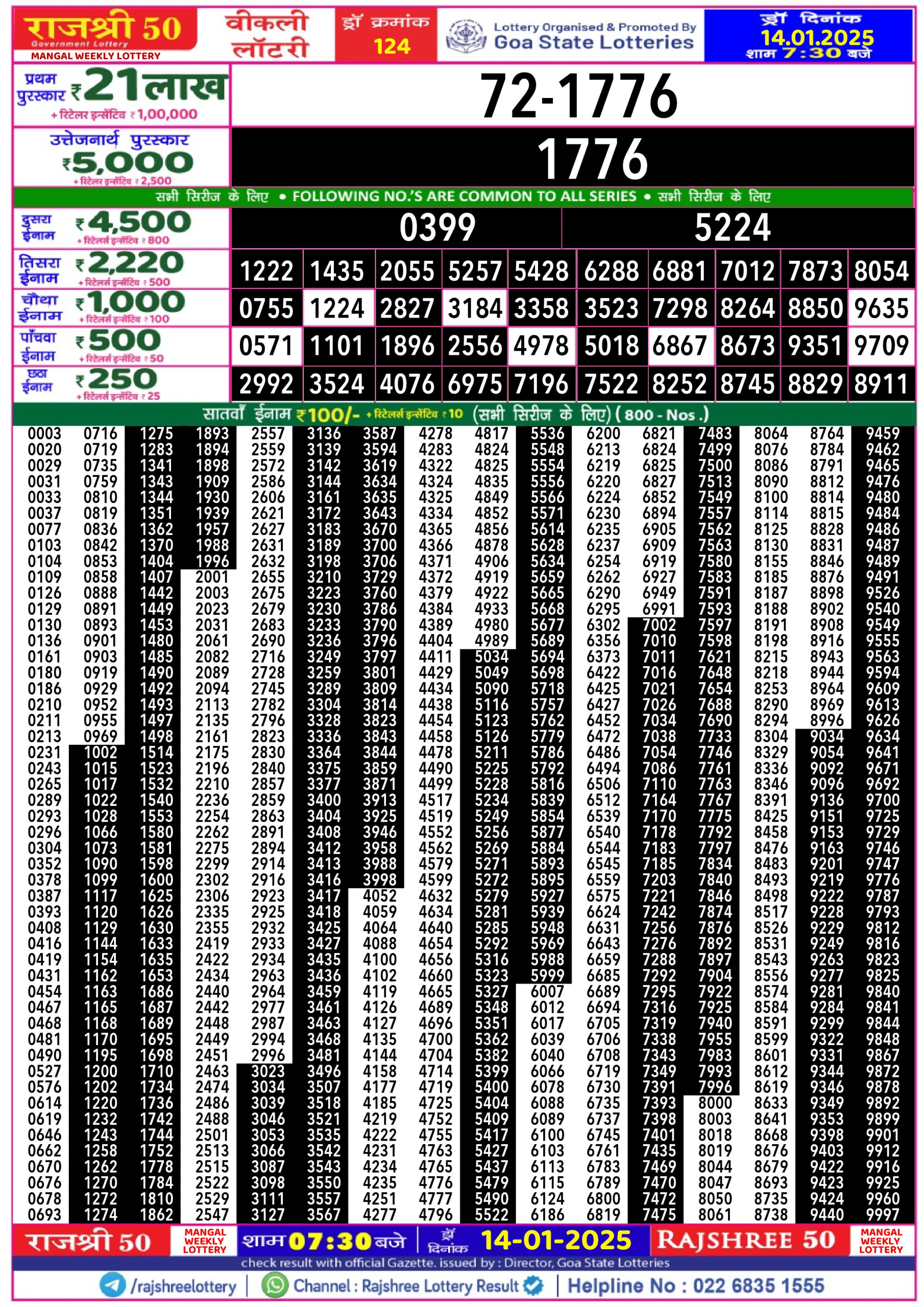 Rajshree 50 Lottery 7:30PM Result 14.1.25