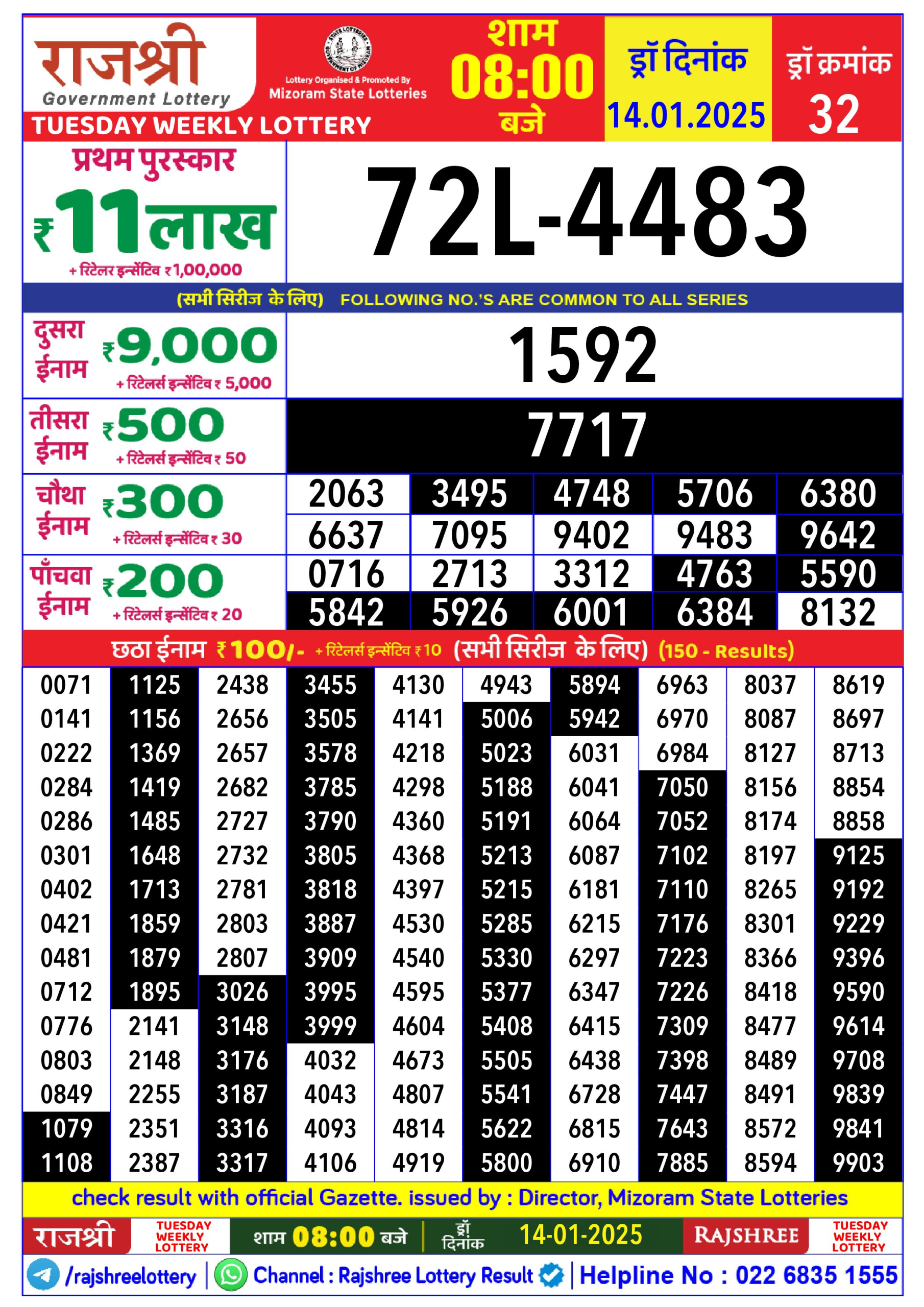 Rajshree  Weekly Lottery 8PM Result 14.1.25